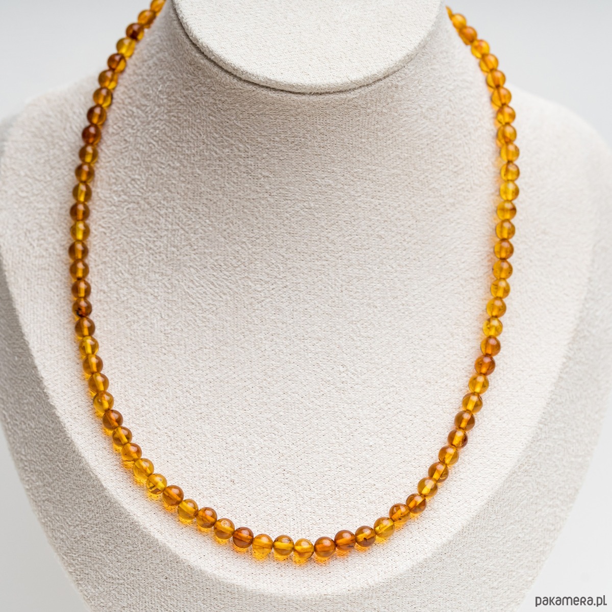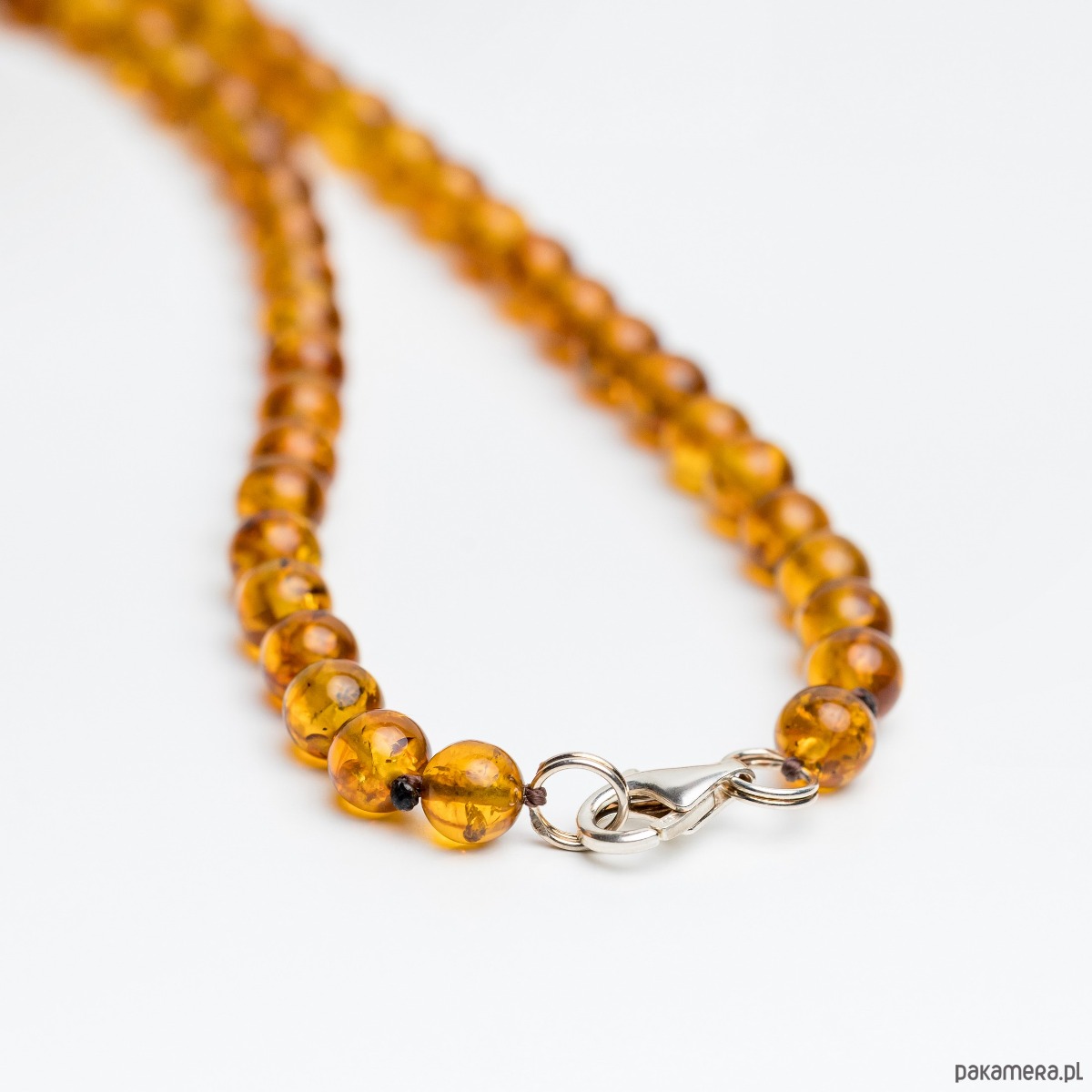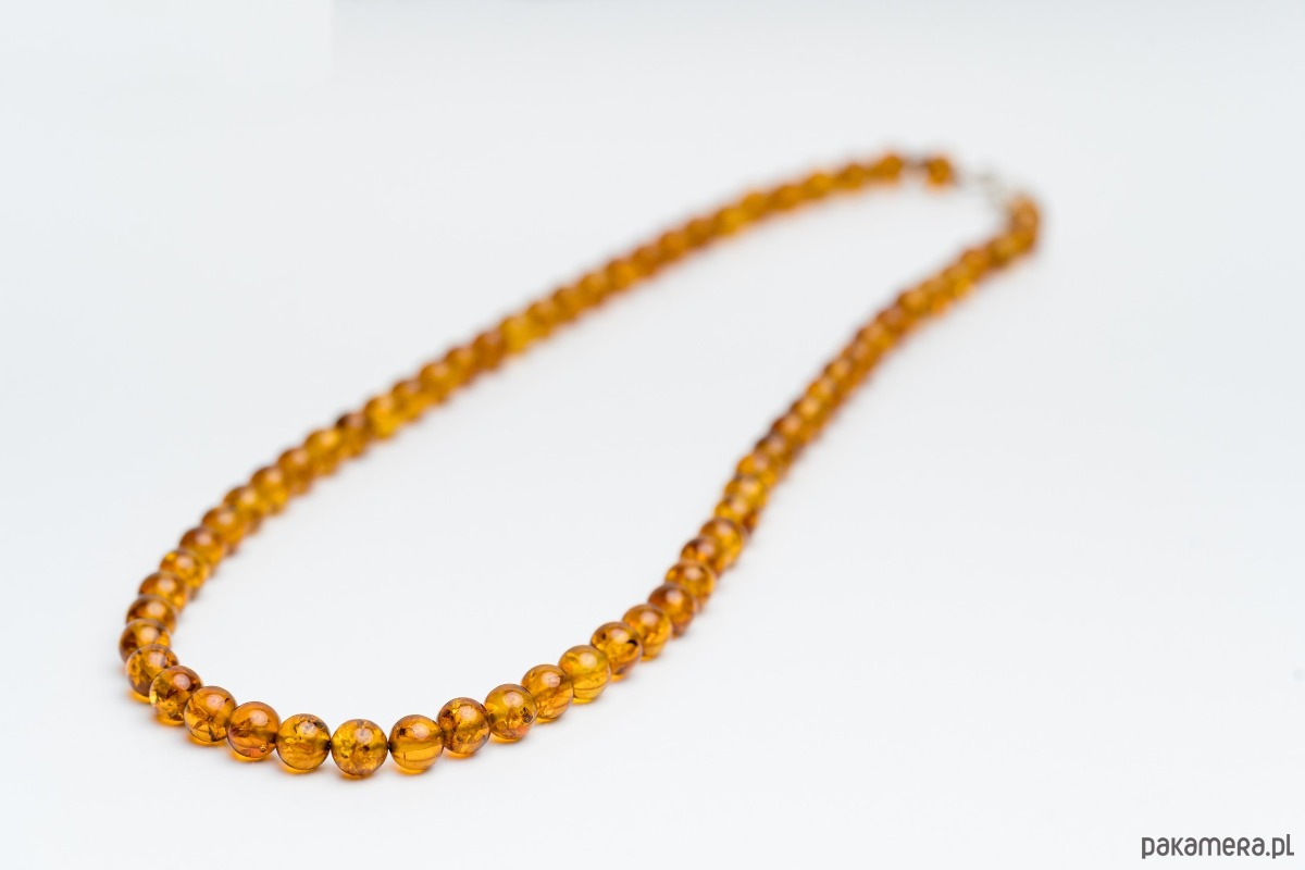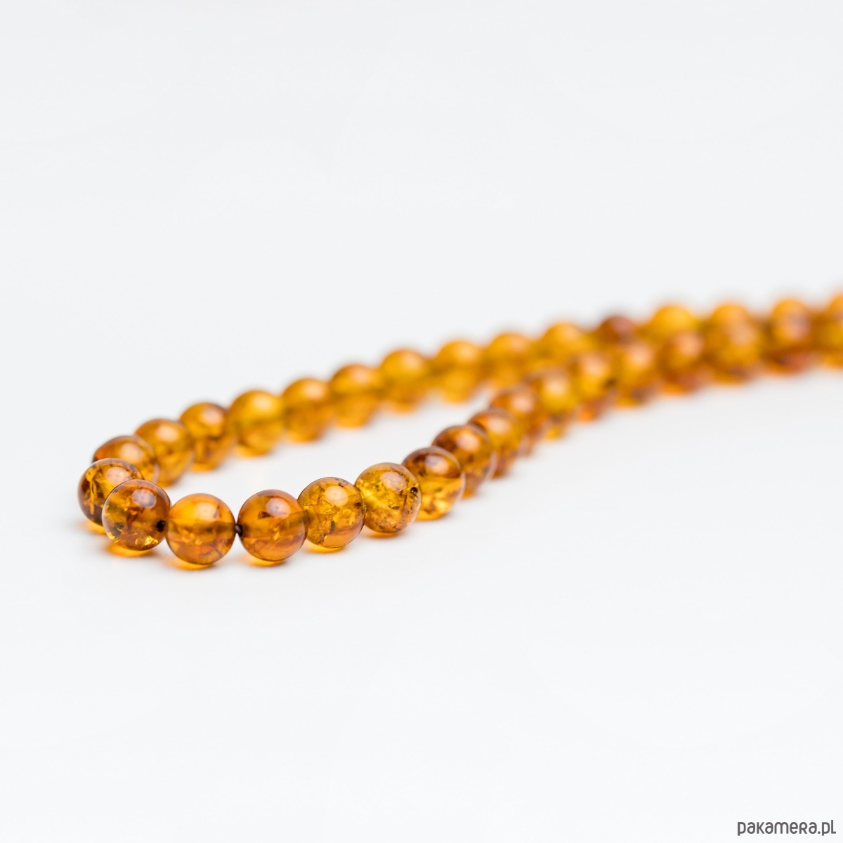 Klasyczny naszyjnik z naturalnego bursztynu bałtyckiego, wykonany z regularnych bursztynowych kulek o średnicy 8 mm. Starannie dobrane kamienie zachwycają ciepłą, miodowo-koniakową barwą oraz naturalnymi inkluzjami, dzięki którym każdy naszyjnik ma unikatowy charakter.