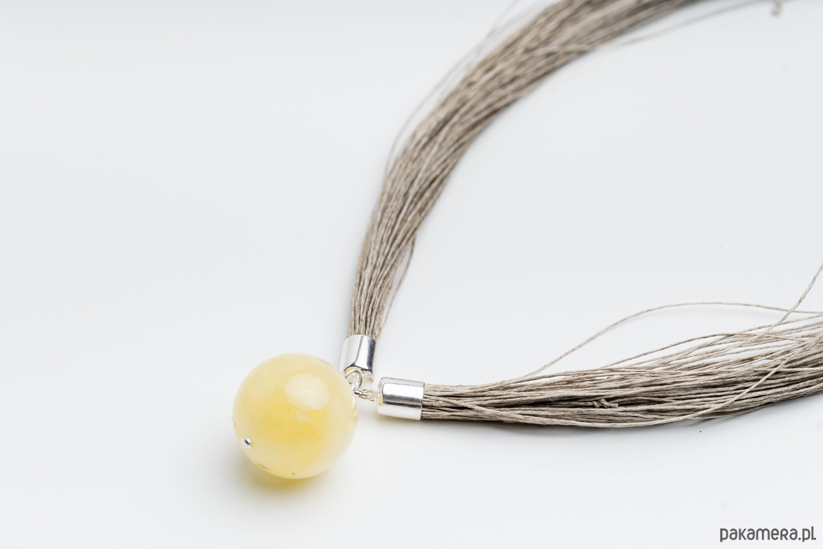 Kula bursztynu zawieszona jest na lnianym sznurku, który podkreśla organiczny charakter biżuterii. Srebrne elementy i zapięcie dodają całości elegancji i trwałości. Naszyjnik doskonale sprawdzi się jako wyrazisty, ale spokojny akcent stylizacji – idealny dla miłośniczek naturalnej, ponadczasowej biżuterii.