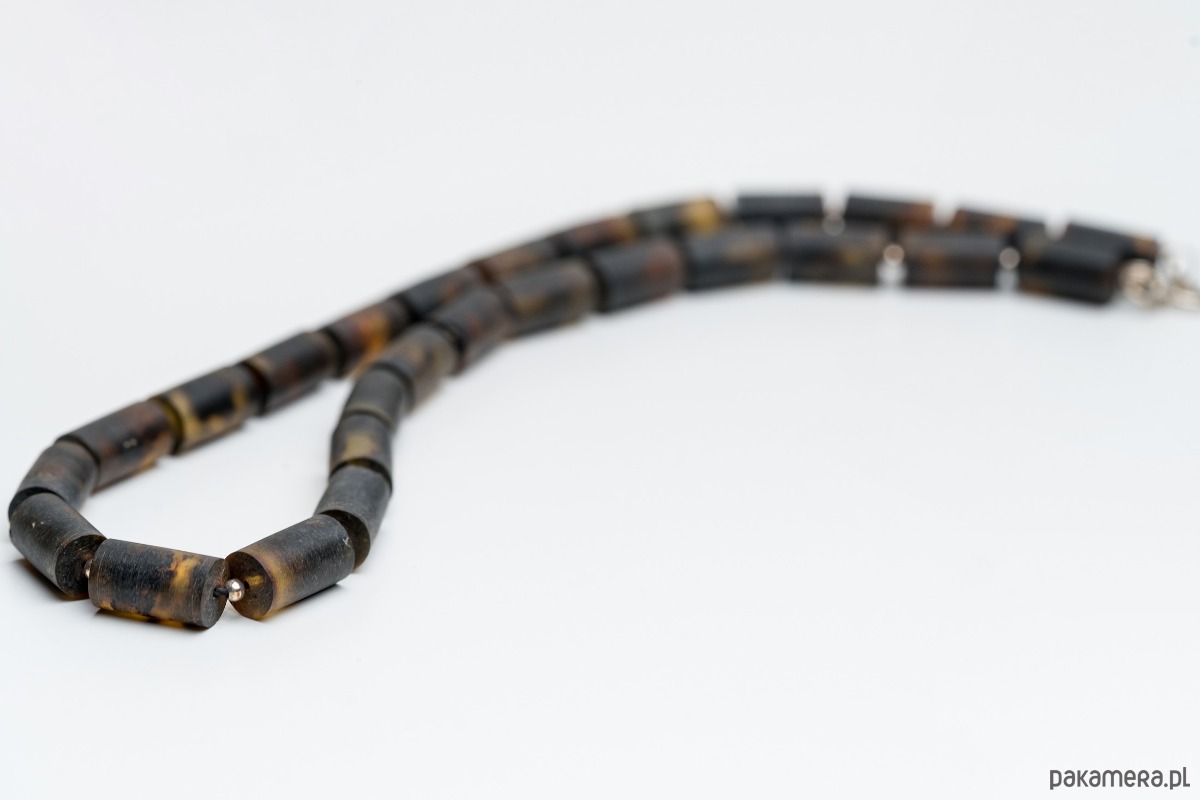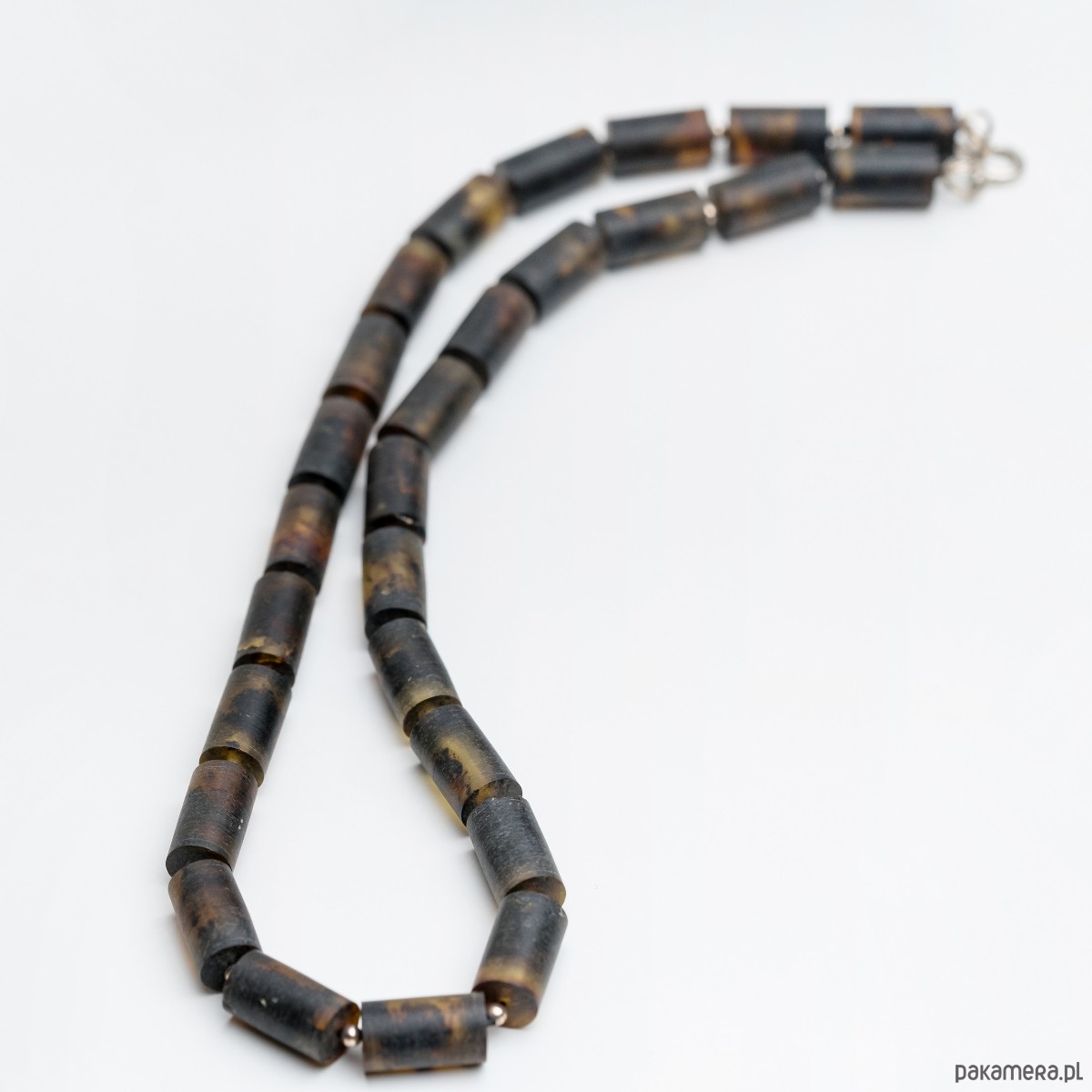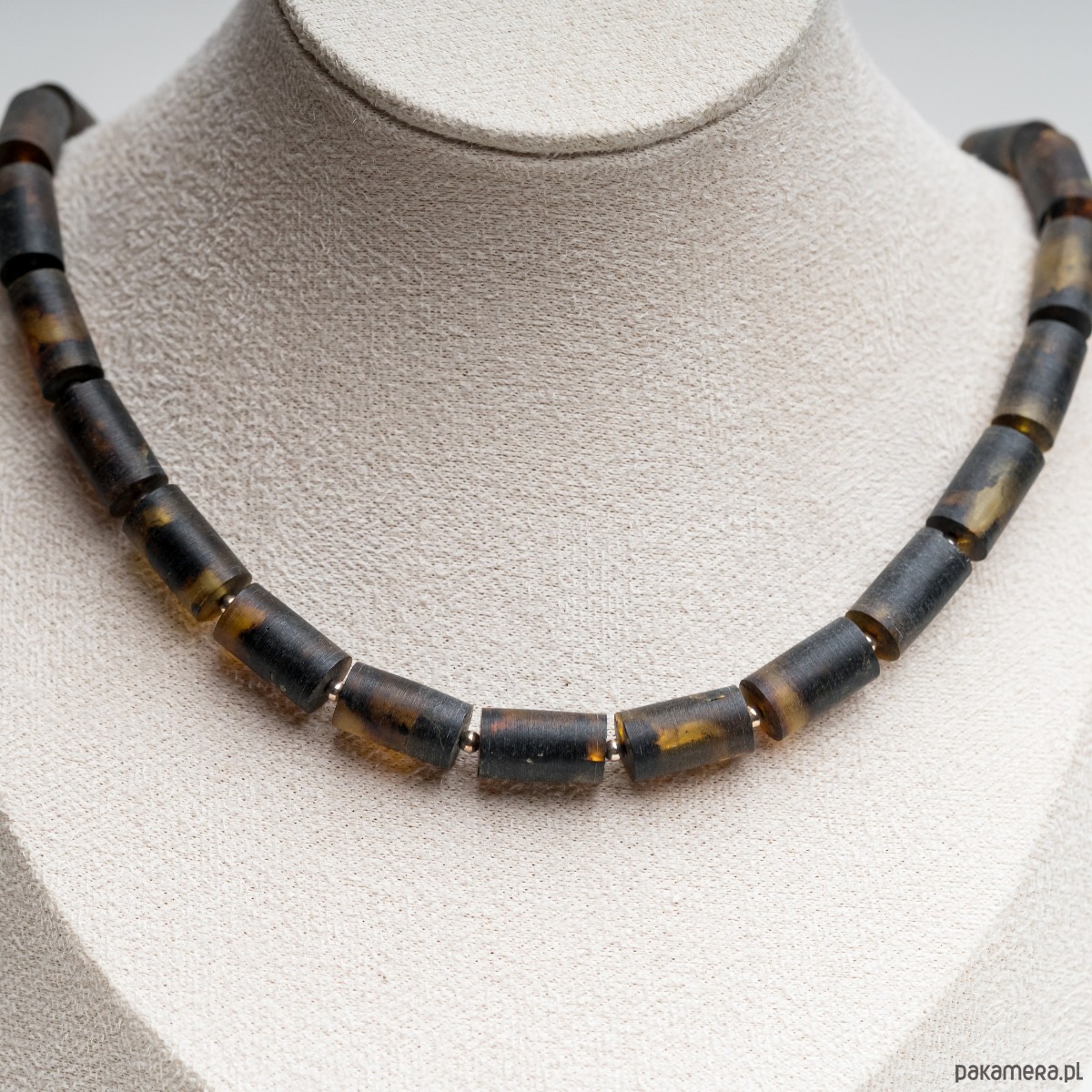 Wyjątkowy naszyjnik wykonany z naturalnego bursztynu bałtyckiego w formie cylindrycznych koralików o surowym, matowym wykończeniu. Każdy kamień zachowuje swoją naturalną fakturę i unikalne przejścia barw, od głębokiego koniaku po ciemne, ziemiste odcienie.