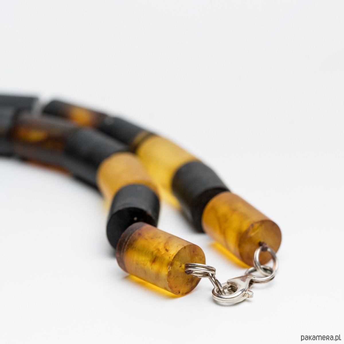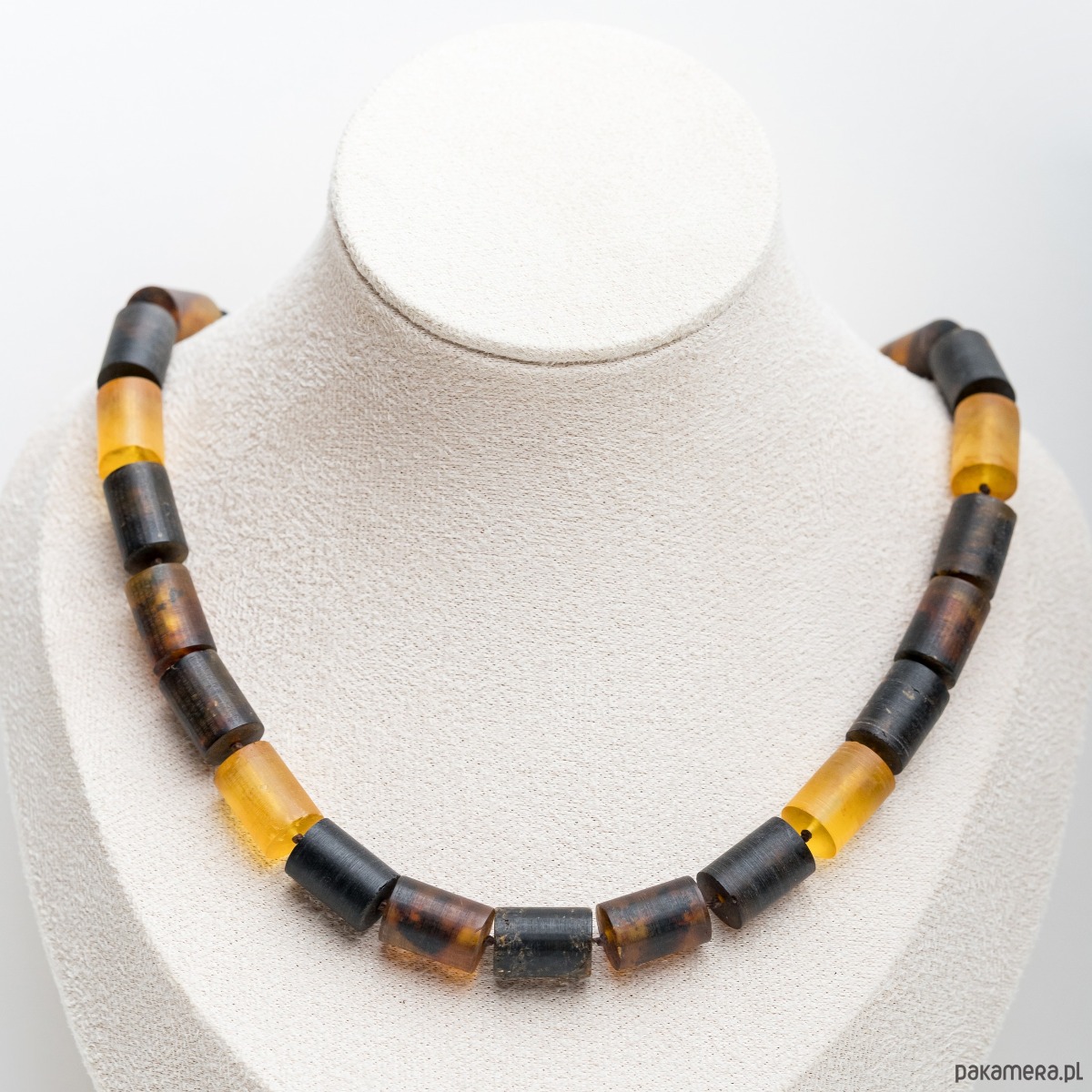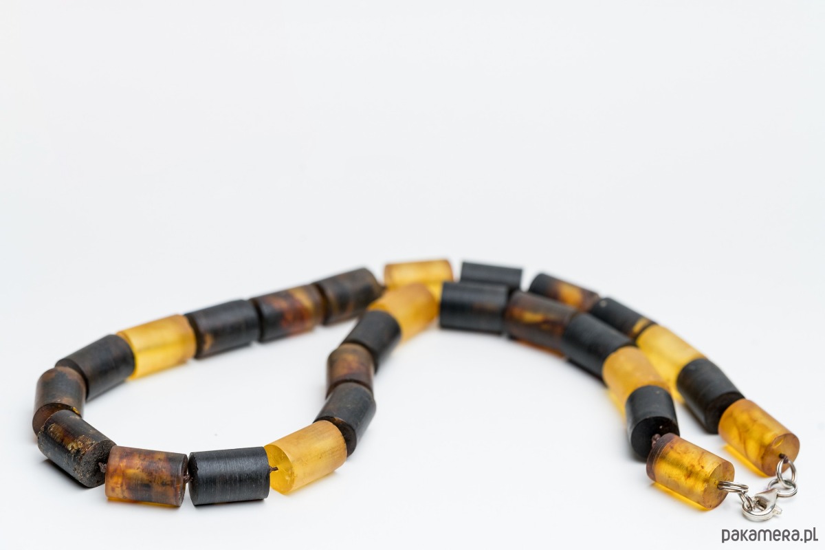 Wyjątkowy naszyjnik wykonany z naturalnego bursztynu bałtyckiego w formie cylindrycznych koralików. Każdy kamień zachowuje swoją naturalną fakturę i unikalne przejścia barw, od jasnego po ciemne, ziemiste odcienie.