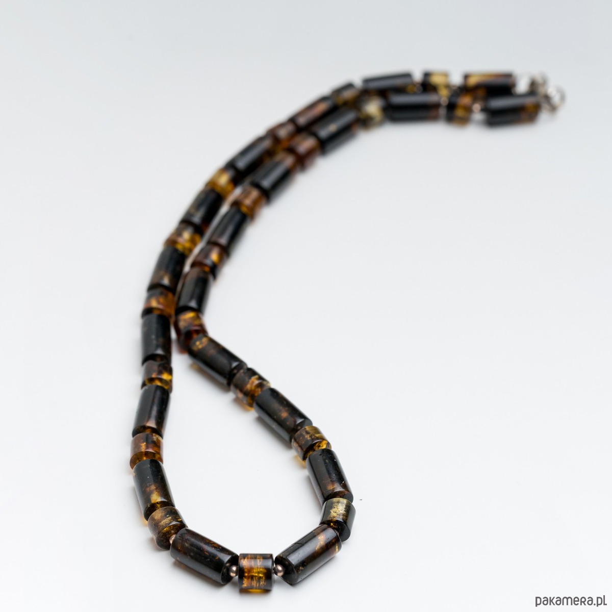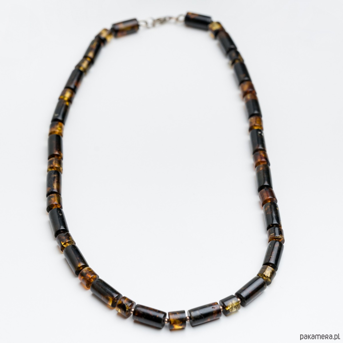 Wyjątkowy naszyjnik wykonany z naturalnego bursztynu bałtyckiego w formie cylindrycznych koralików. Każdy kamień zachowuje swoją naturalną fakturę i unikalne przejścia barw, od głębokiego koniaku po ciemne, ziemiste odcienie.
