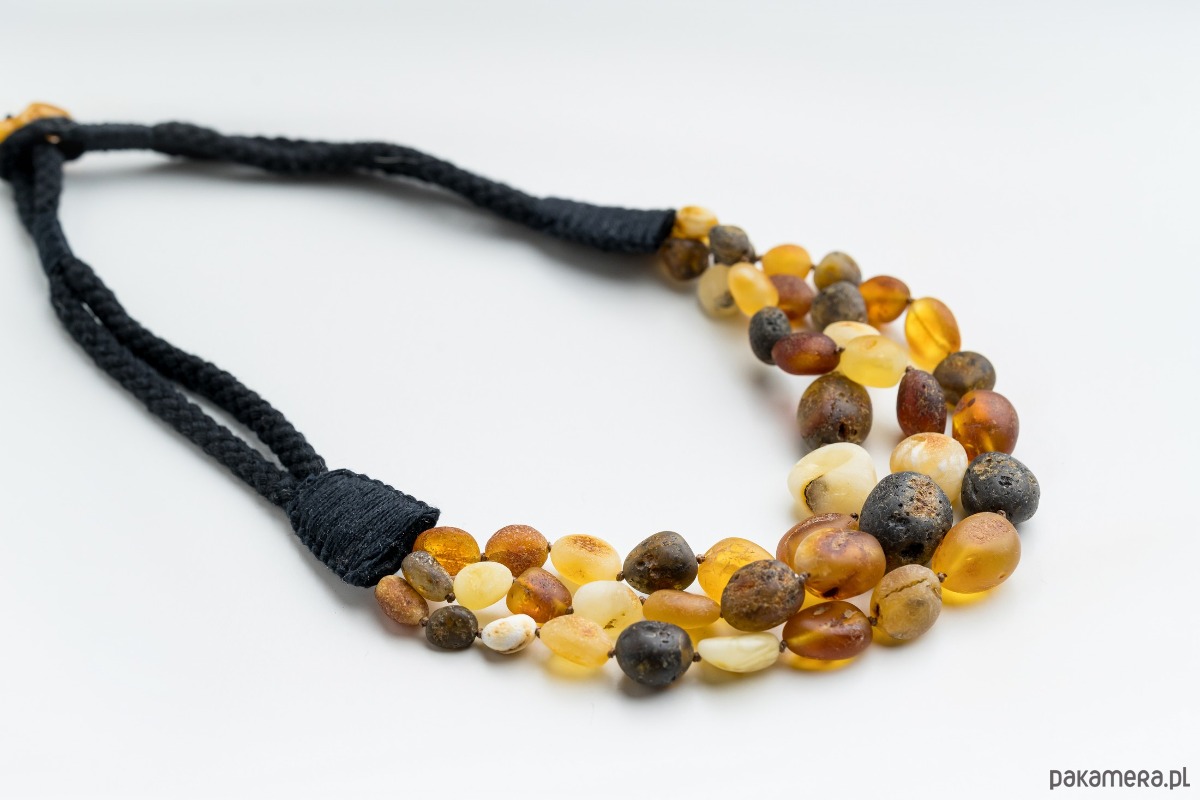 Naszyjnik ma długość 48 cm, dzięki czemu idealnie układa się na szyi i pasuje zarówno do codziennych stylizacji, jak i bardziej eleganckich zestawów. Elementy zostały nawleczone na mocny, czarny sznurek, który podkreśla naturalne piękno bursztynu oraz wykończone splotem makramowym.