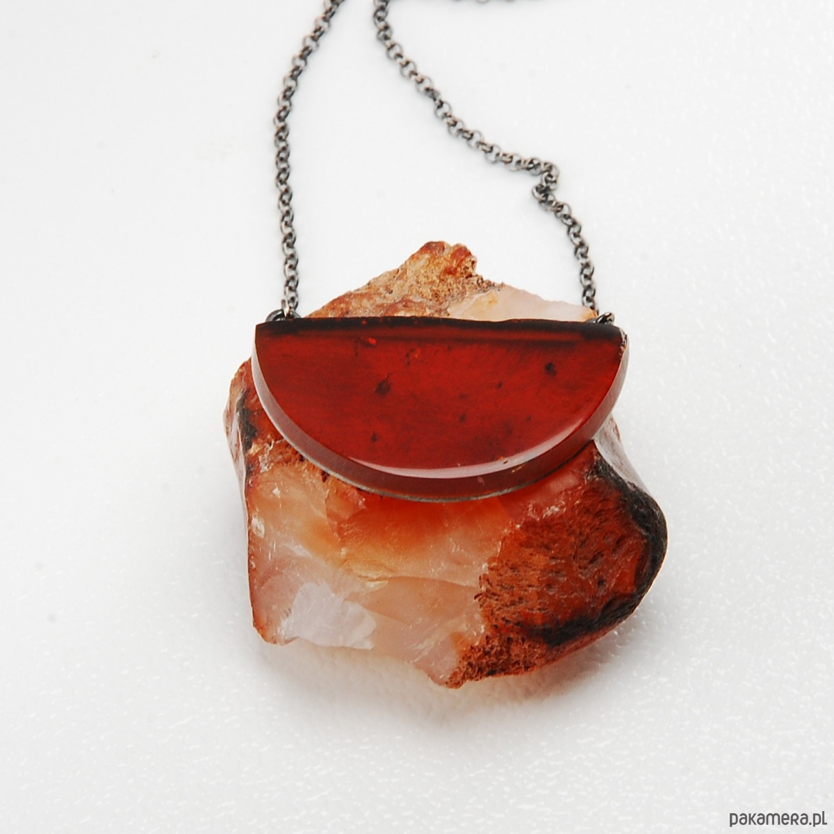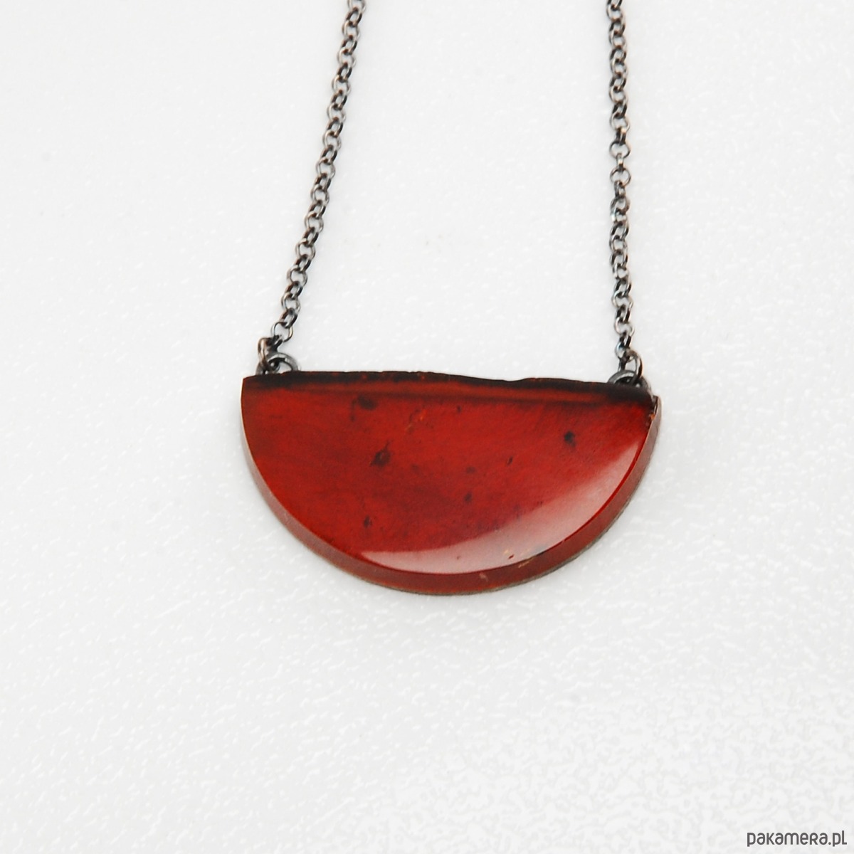 Minimalistyczny naszyjnik bursztynowy. Wykonany z oksydowanego srebra próby 925 oraz bursztynu bałtyckiego w kolorze wiśniowym z nieregularną górną krawędzią. Bursztyn łapie refleksy, które odbijają się od srebrnej podstawy. Górna powierzchnia bursztynu jest wypolerowana a brzegi matowe. Wymiary bursztynu 32x16mm, wysokość 3mm, długość całkowita naszyjnika 55cm.