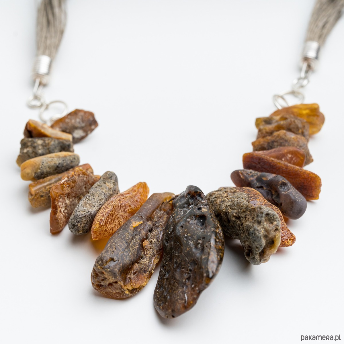 Kamienie nawleczone są na lniany sznurek, który podkreśla organiczny styl biżuterii i nadaje jej lekkości oraz autentyczności. Srebrne elementy i zapięcie subtelnie kontrastują z surowością bursztynu, zapewniając jednocześnie trwałość i komfort noszenia. Długość około 50 cm sprawia, że naszyjnik efektownie układa się na szyi, stanowiąc mocny, wyrazisty akcent stylizacji.