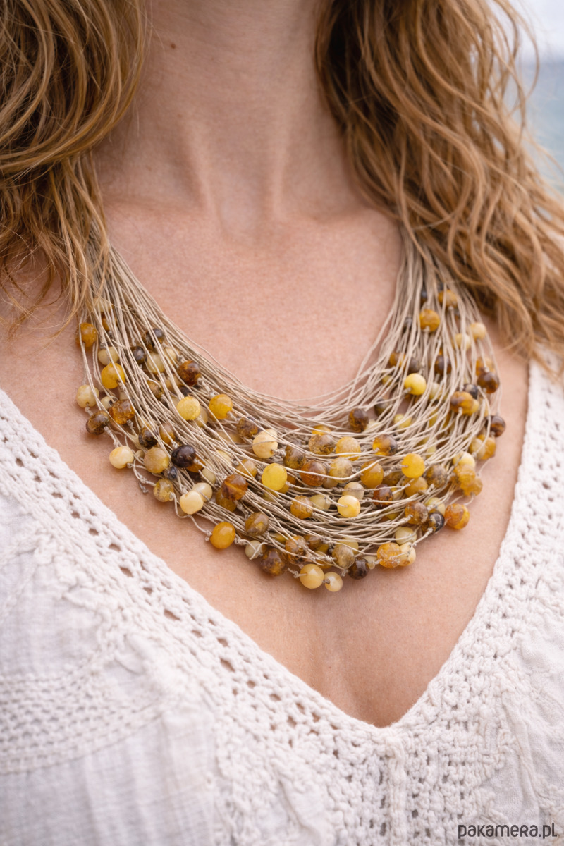 Ten lekki naszyjnik został wykonany z bursztynowych koralików w klasycznych odcieniach: koniakowym, cytrynowym i mlecznym. Surowe, niepolerowane koraliki z bursztynu zostały nawleczone na wytrzymały lniany sznurek, a każdy z nich oddzielony jest małym supełkiem. Połączenie wielobarwnych bursztynów tworzy subtelną i niepowtarzalną kompozycję.
