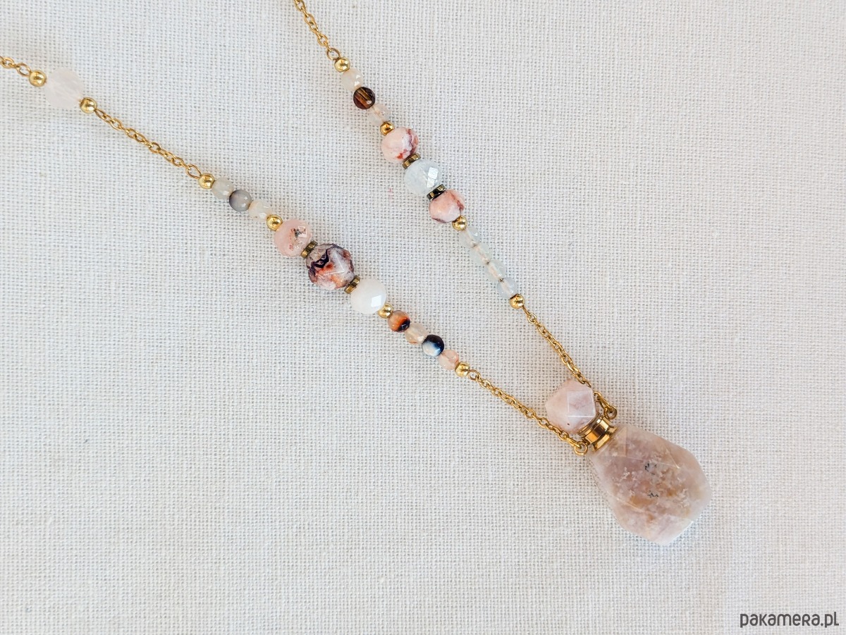Piękny i wyjątkowy naszyjnik z elegancką buteleczką wykonaną z naturalnego kamienia – agatu sakura, który zachwyca subtelnymi odcieniami i unikalnym wzorem. Perfumetka posiada odkręcaną formę, dzięki czemu można z łatwością napełnić ją ulubionym olejkiem zapachowym lub perfumami, mając swój ulubiony aromat zawsze przy sobie. Łańcuszek został wykonany z wysokiej jakości stali szlachetnej w kolorze złotym, co zapewnia trwałość i odporność na codzienne użytkowanie. Całość jest dodatkowo ozdobiona drobnymi kamieniami, które nadają biżuterii elegancji i delikatnego blasku, czyniąc ją idealnym dodatkiem zarówno na co dzień, jak i na specjalne okazje.