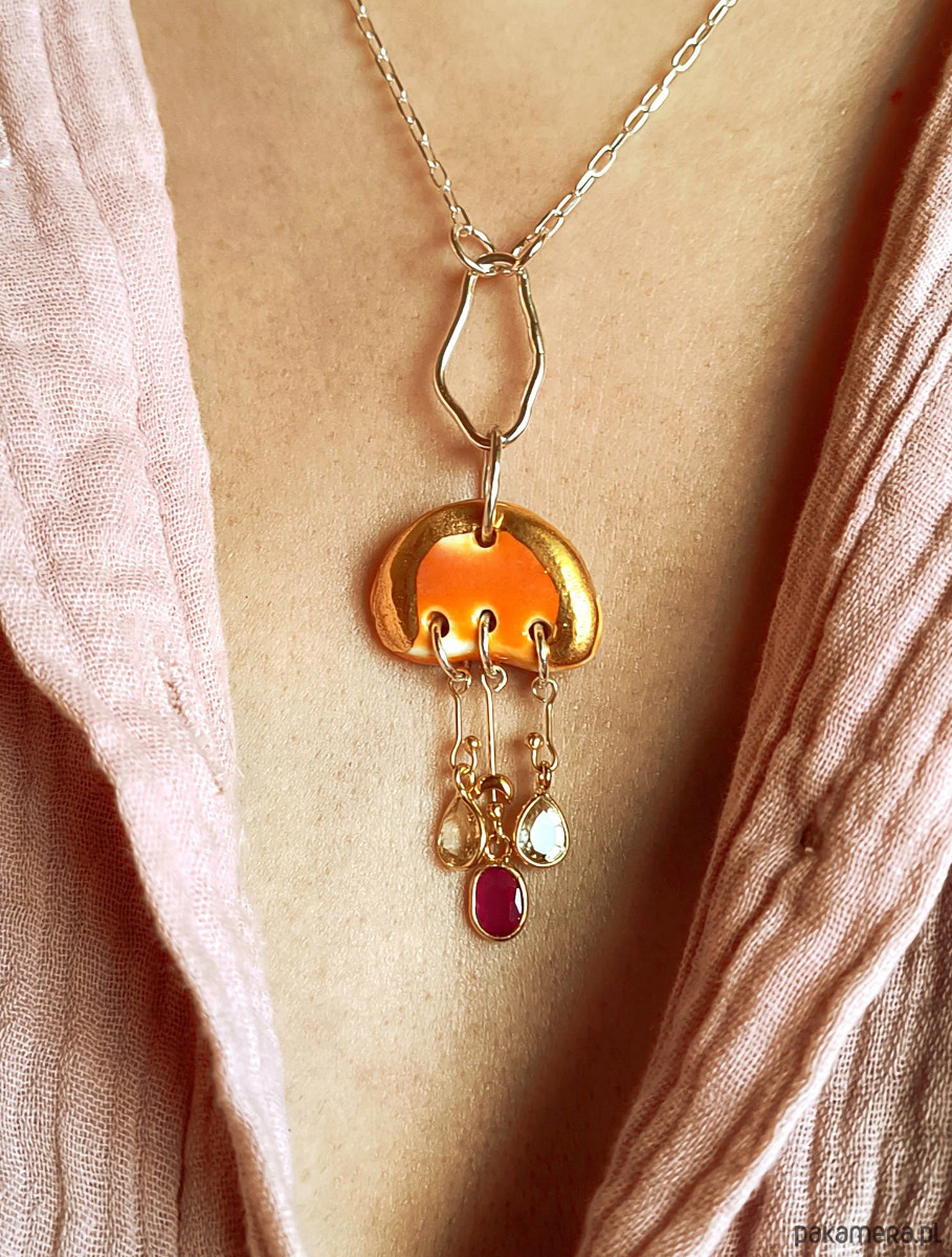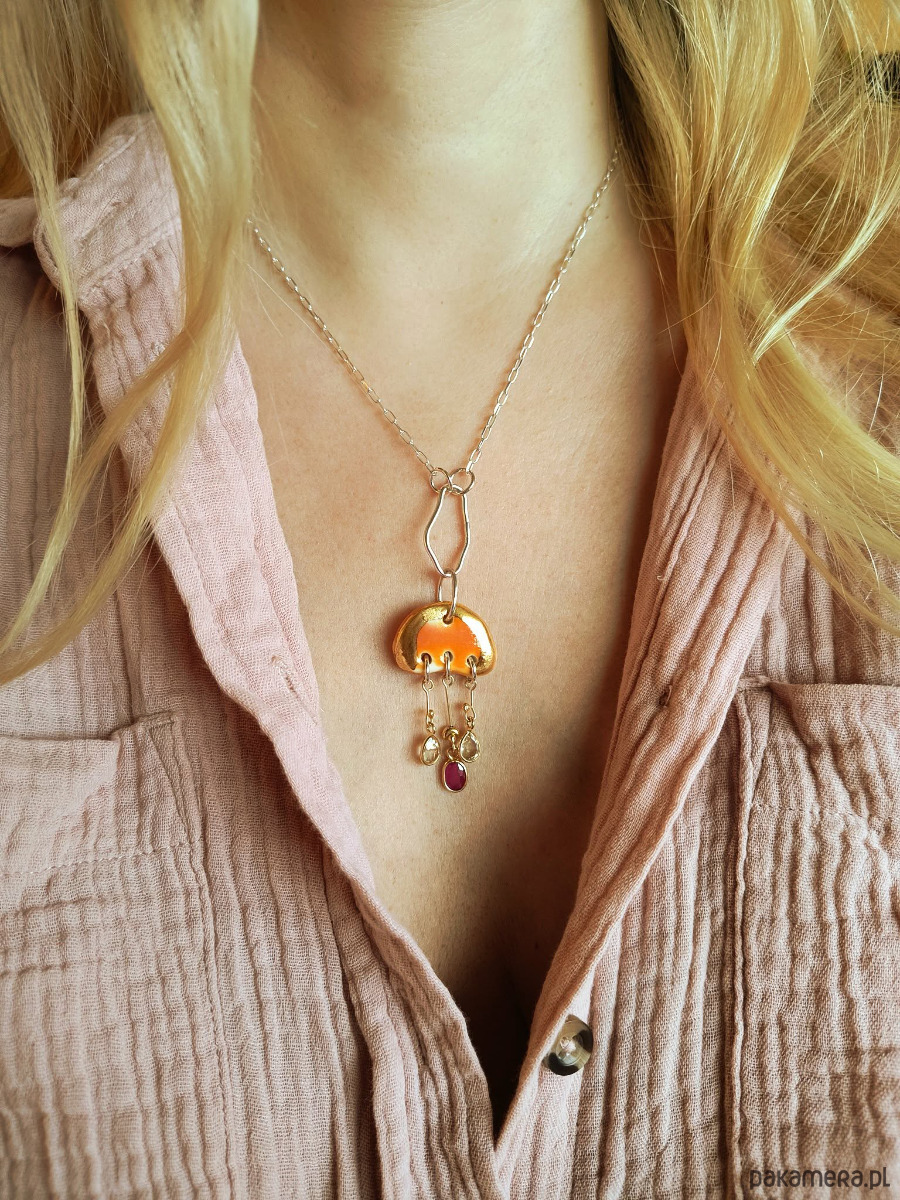 Materiał: srebro próby 925, 24-karatowe złoto, porcelana częściowo pokryta 24-karatowym złotem, kamienie naturalne: kryształ górski, cytryn, rubin