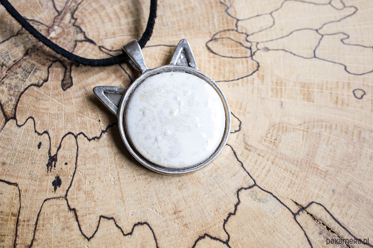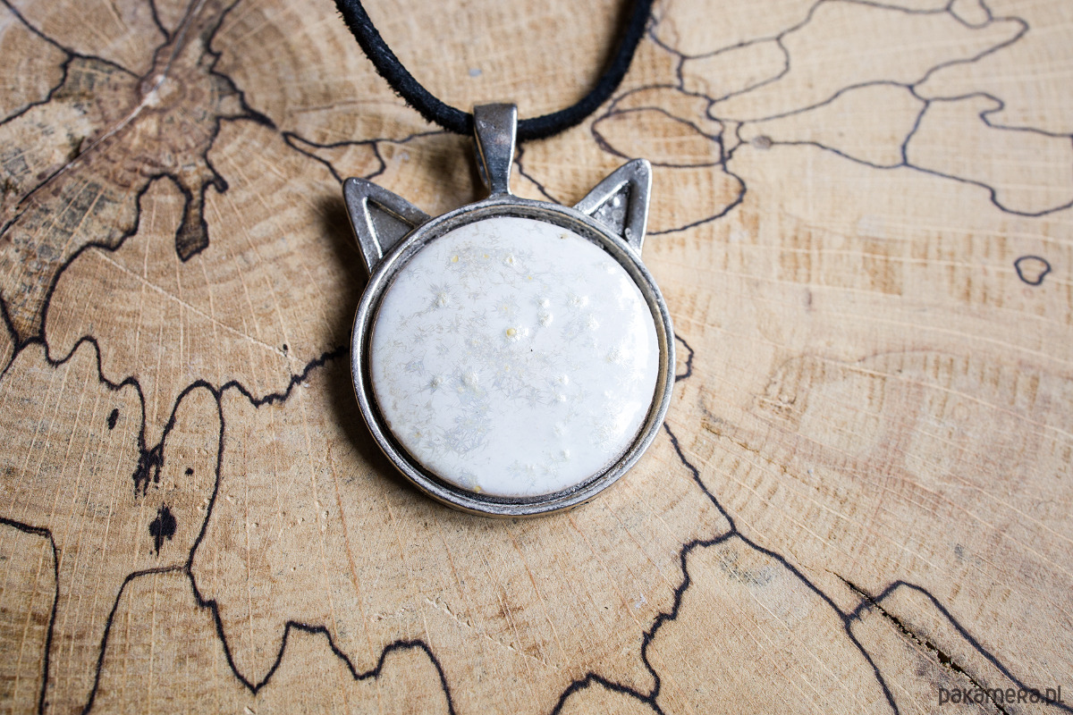 Naszyjnik ceramiczny w oprawie, kot, perłowy