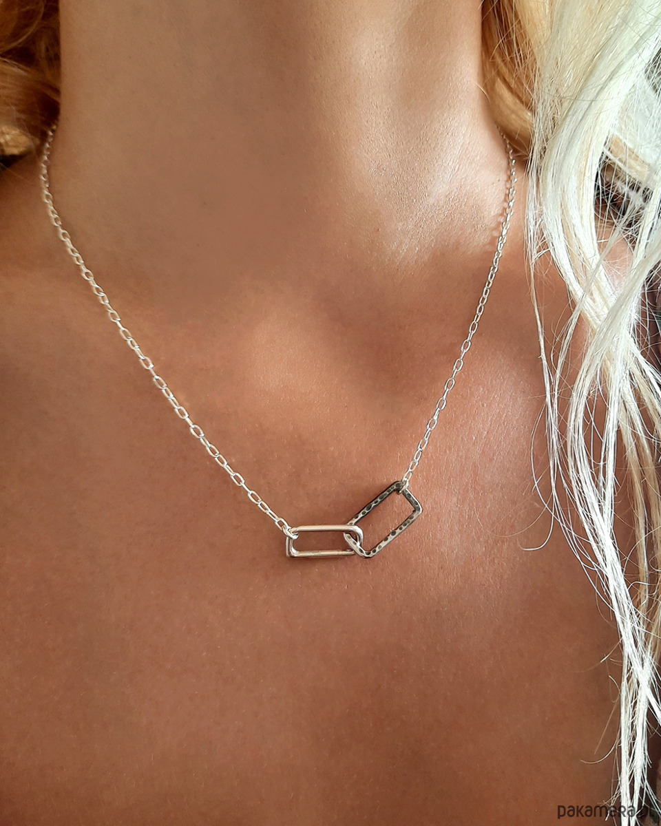 Dwa asymetryczne ogniwa centralne nadają charakter, a szyję oplata już delikatniejszy łańcuszek.