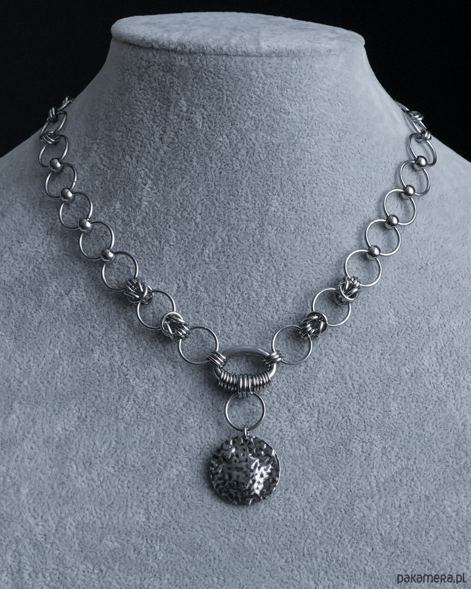Nowoczesny i oryginalny, dość masywny naszyjnik wykonany ręcznie z wykorzystaniem techniki chainmaille. Głównym elementem naszyjnika jest okrągła, wypukła blaszka o nieregularnej, fakturowanej powierzchnia.