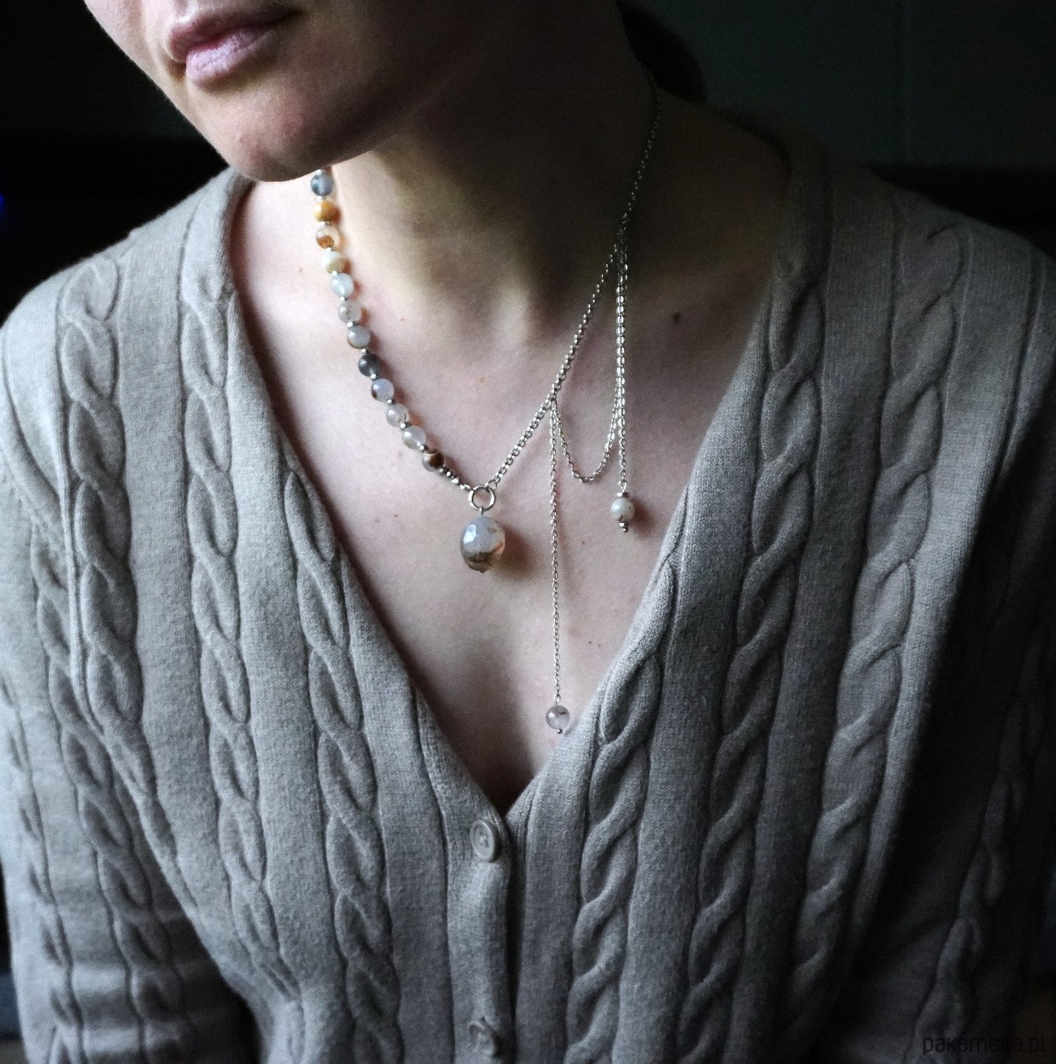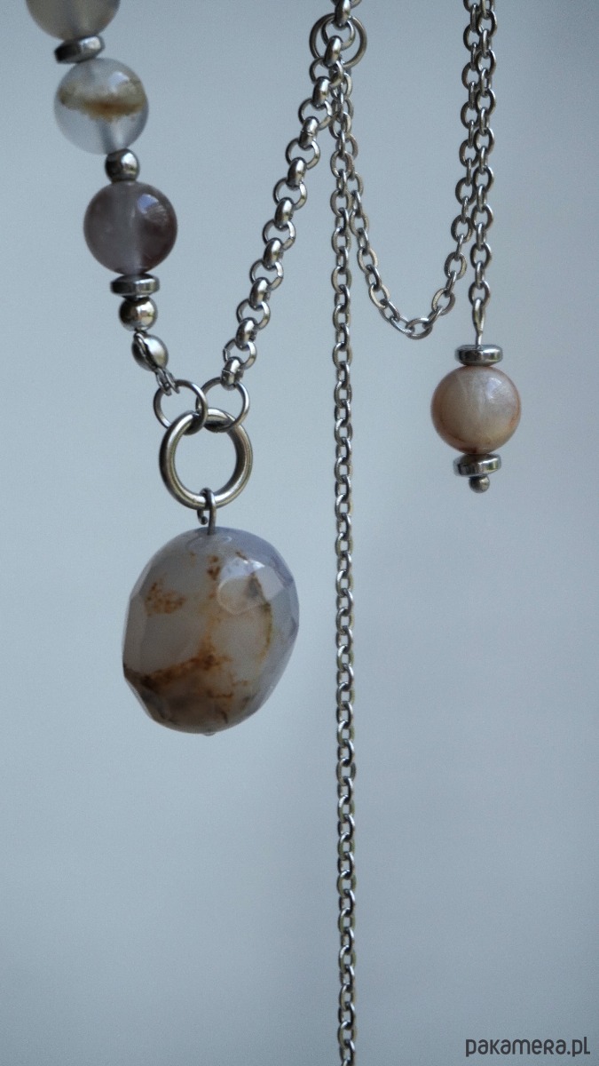 Ten subtelny naszyjnik powstał w harmonii naturalnych odcieni i faktur. Delikatne koraliki chalcedonu w miękkiej, pastelowej palecie płynnie przechodzą w chłodny połysk hematytu, tworząc równowagę między ciepłem a chłodem, delikatnością a siłą. Centralnym akcentem jest fasetowana kropla chalcedonu, podkreślająca naturalną głębię kamienia.