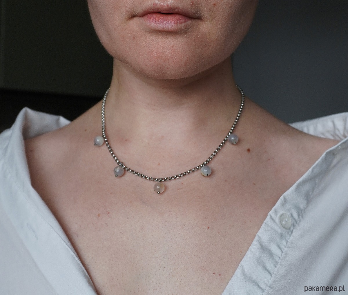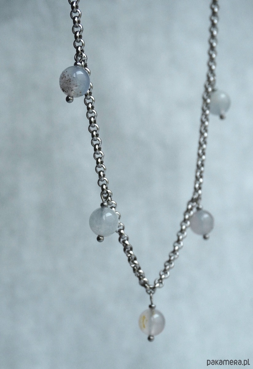 Delikatny naszyjnik wykonany ręcznie, stworzony dla osób, które cenią minimalizm i naturalną energię kamieni. Biżuteria wykonana jest z wytrzymałego stalowego łańcuszka z zawieszkami z naturalnego chalcedonu – kamienia harmonii i wewnętrznej równowagi.