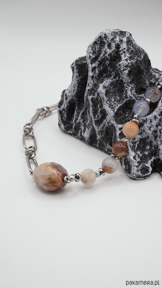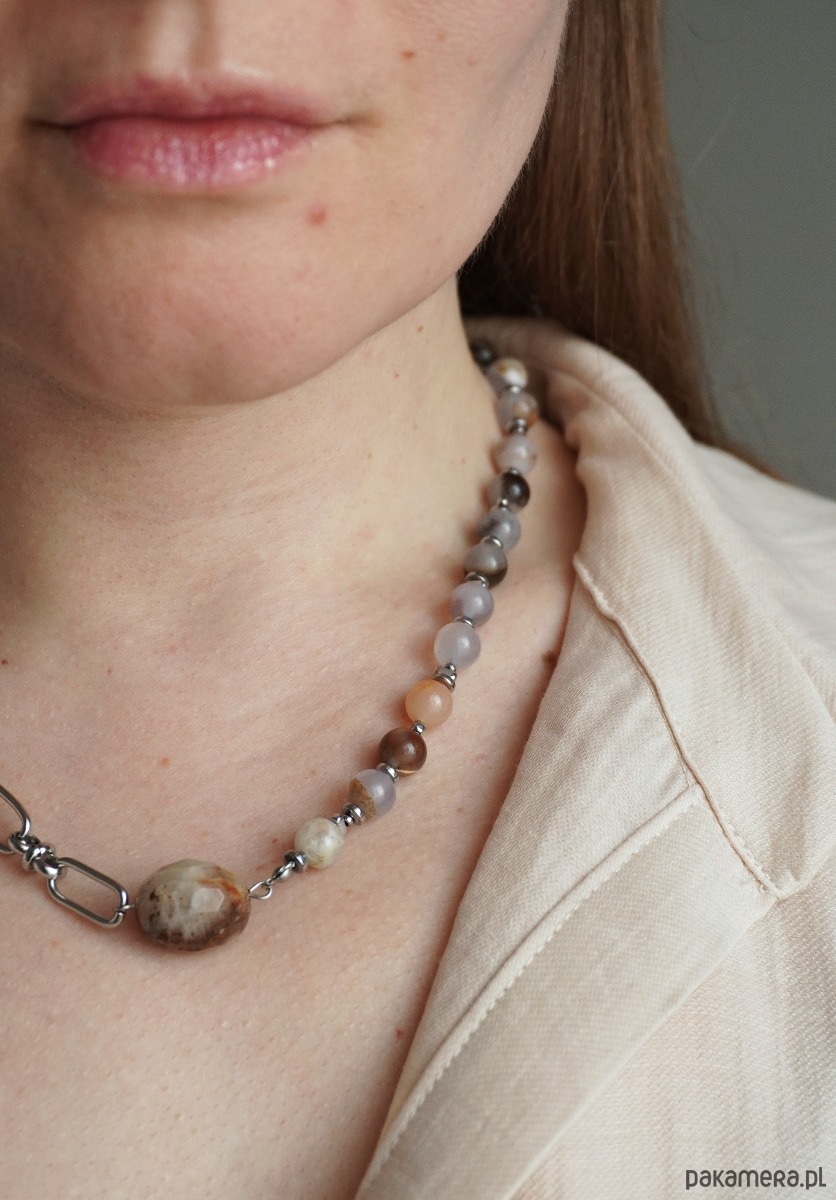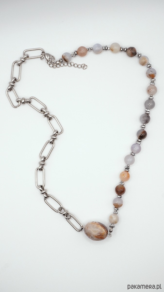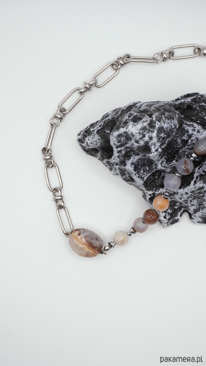 To stylowy naszyjnik, który łączy w sobie naturalną energię kamienia i nowoczesny design. Jedna połowa ozdoby wykonana jest z gładkich koralików z naturalnego chalcedonu w delikatnych szaro-niebieskich i karmelowych odcieniach, druga — z dużych metalowych ogniw, tworzących interesujący kontrast faktur. Centralnym akcentem jest duży owalny koralik z chalcedonu o unikalnym, naturalnym wzorze.
