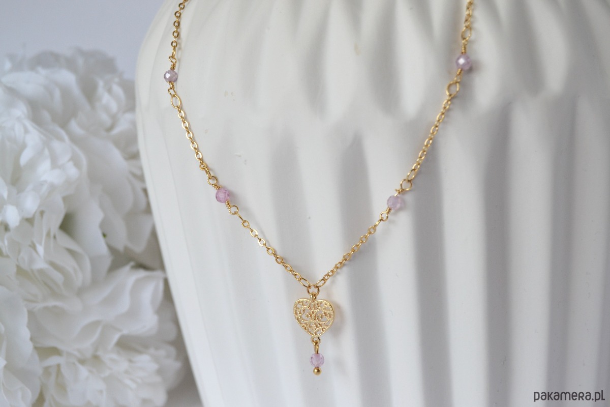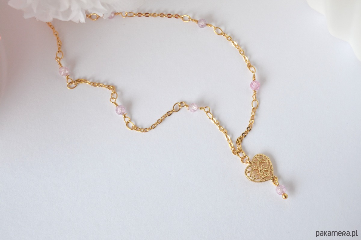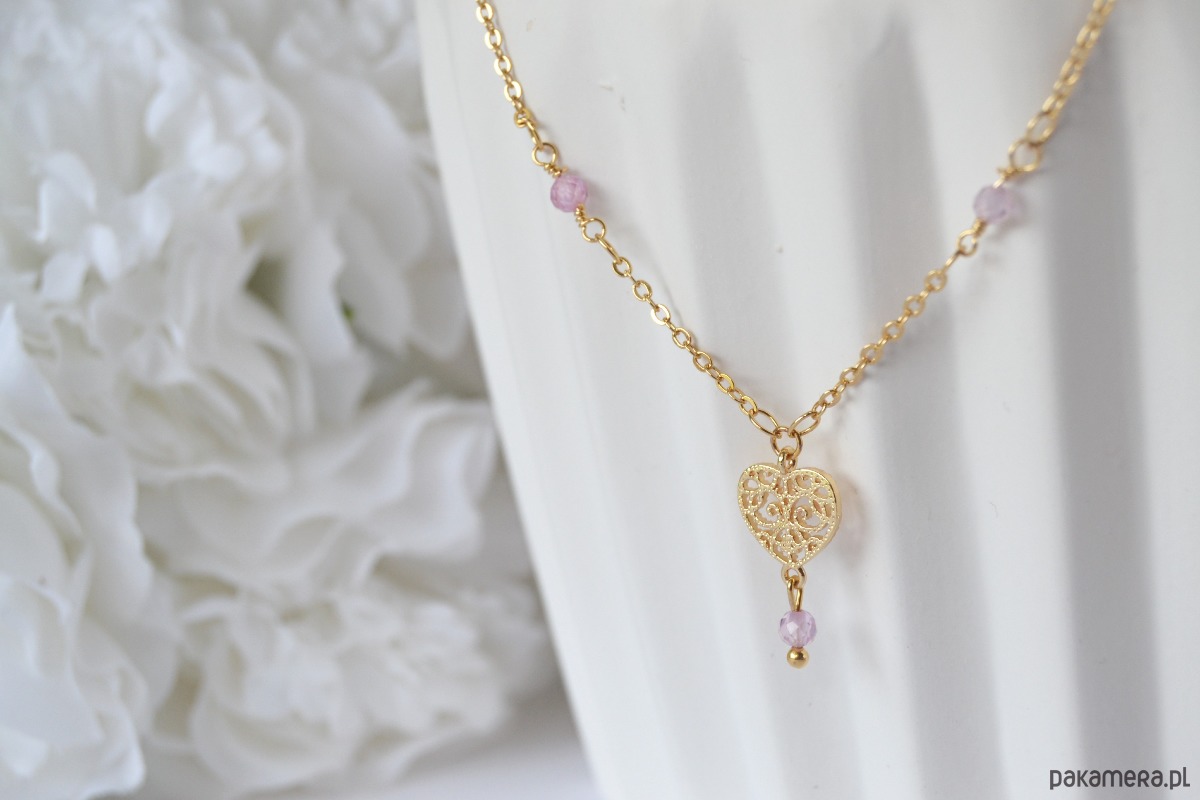 Przepiękny naszyjnik z pozłacanym 24 k złotem ażurowym serduszkiem i różowymi cyrkoniami od Swarovskiego. Wspaniale się prezentuje i jest idealnym prezentem .
