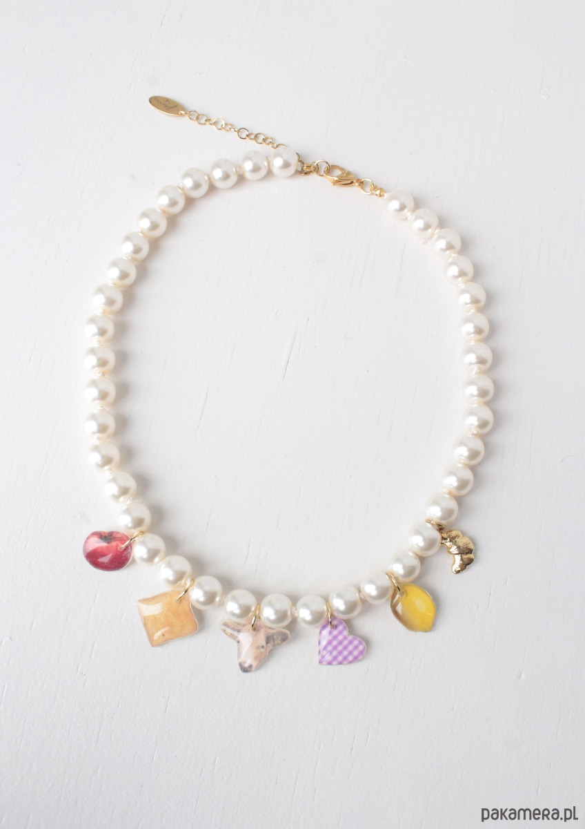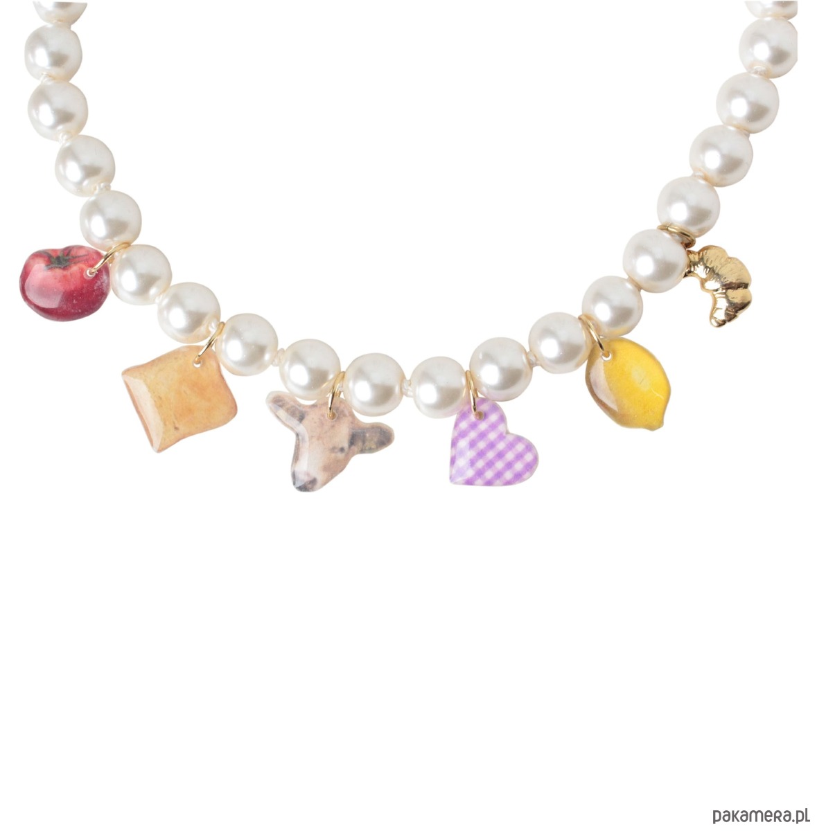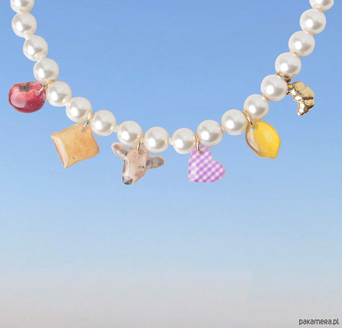 Składa się z pereł szklanych i autorskich zawieszek sygnowanych z tyłu- pomidor, chrupiący tost, alpejska krowa, piknikowe serce, soczysta cytryna i złoty croissant. Wszystko nawleczone na jedwabną kremową nić, a regulowane zapięcie to stal szlachetna pozłacana. Każdy charms zabezpieczony krystaliczną żywicą.