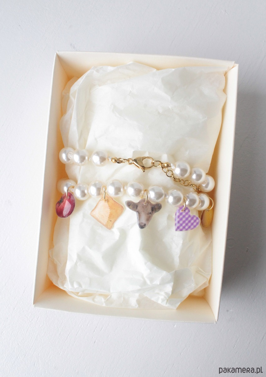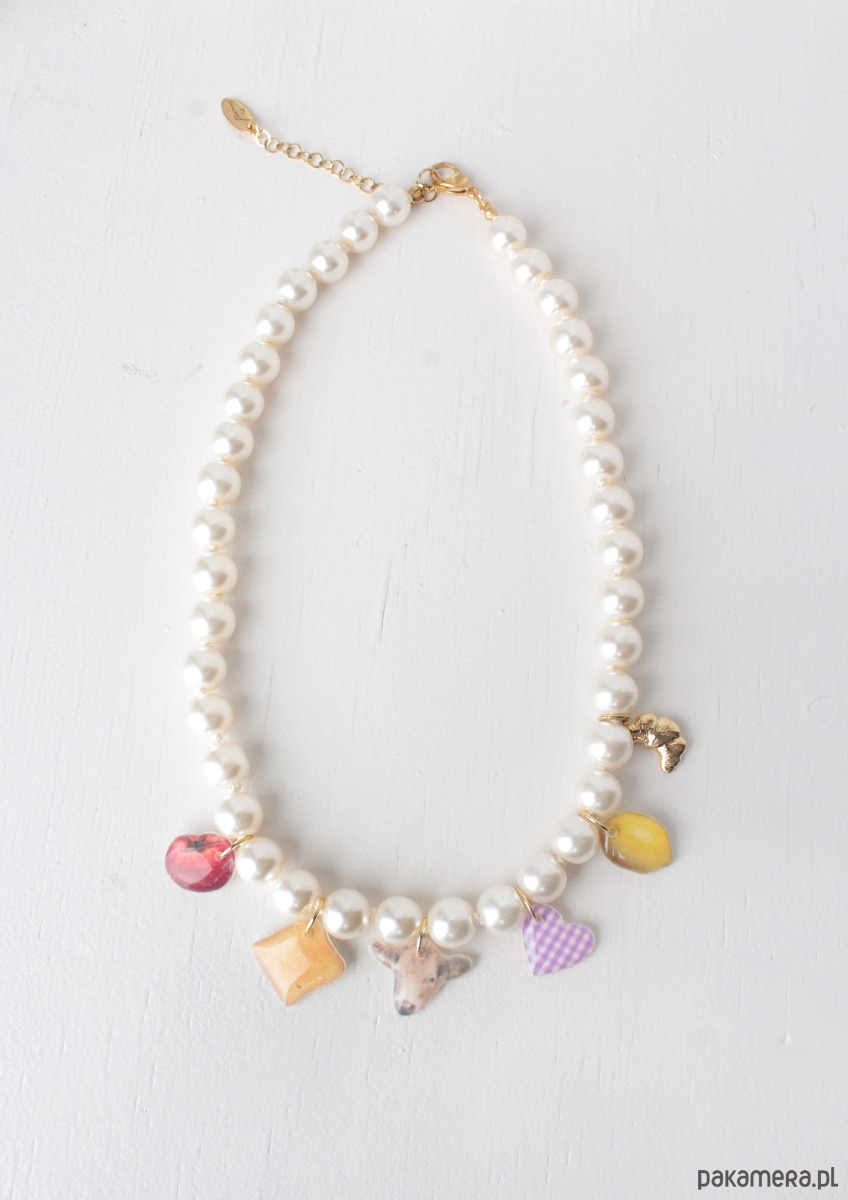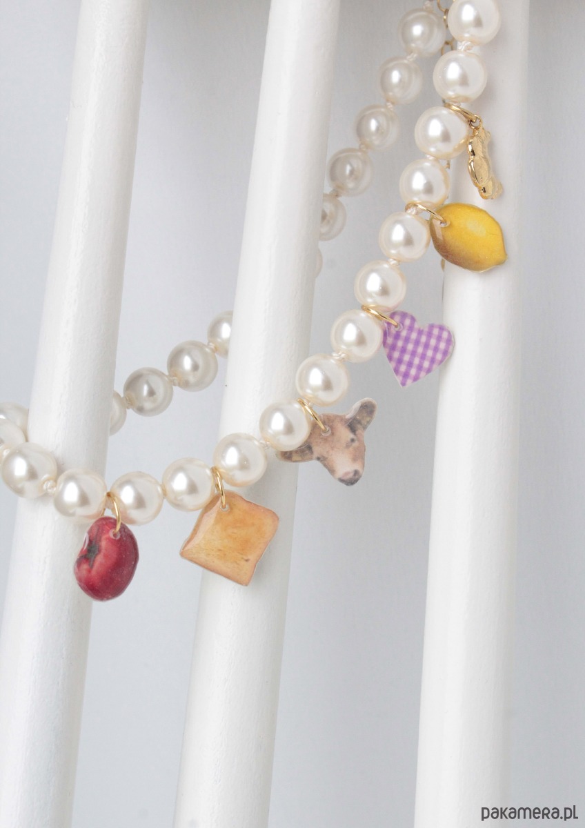 Składa się z pereł szklanych i autorskich zawieszek sygnowanych z tyłu- pomidor, chrupiący tost, alpejska krowa, piknikowe serce, soczysta cytryna i złoty croissant. Wszystko nawleczone na jedwabną kremową nić, a regulowane zapięcie to stal szlachetna pozłacana. Każdy charms zabezpieczony krystaliczną żywicą.