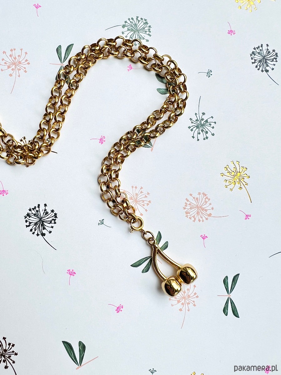 Wykonany ze stali chirurgicznej grubszy łańcuszek ozdobiony jest zawieszką w kształcie wisienek , zakończony serduszkiem z cyrkonią. Zawieszka odpina się i można ją zamontować w dowolnym miejscu na naszyjniku, co daje nam wiele sposobów noszenia. Dostępne również pasujące kolczyki.