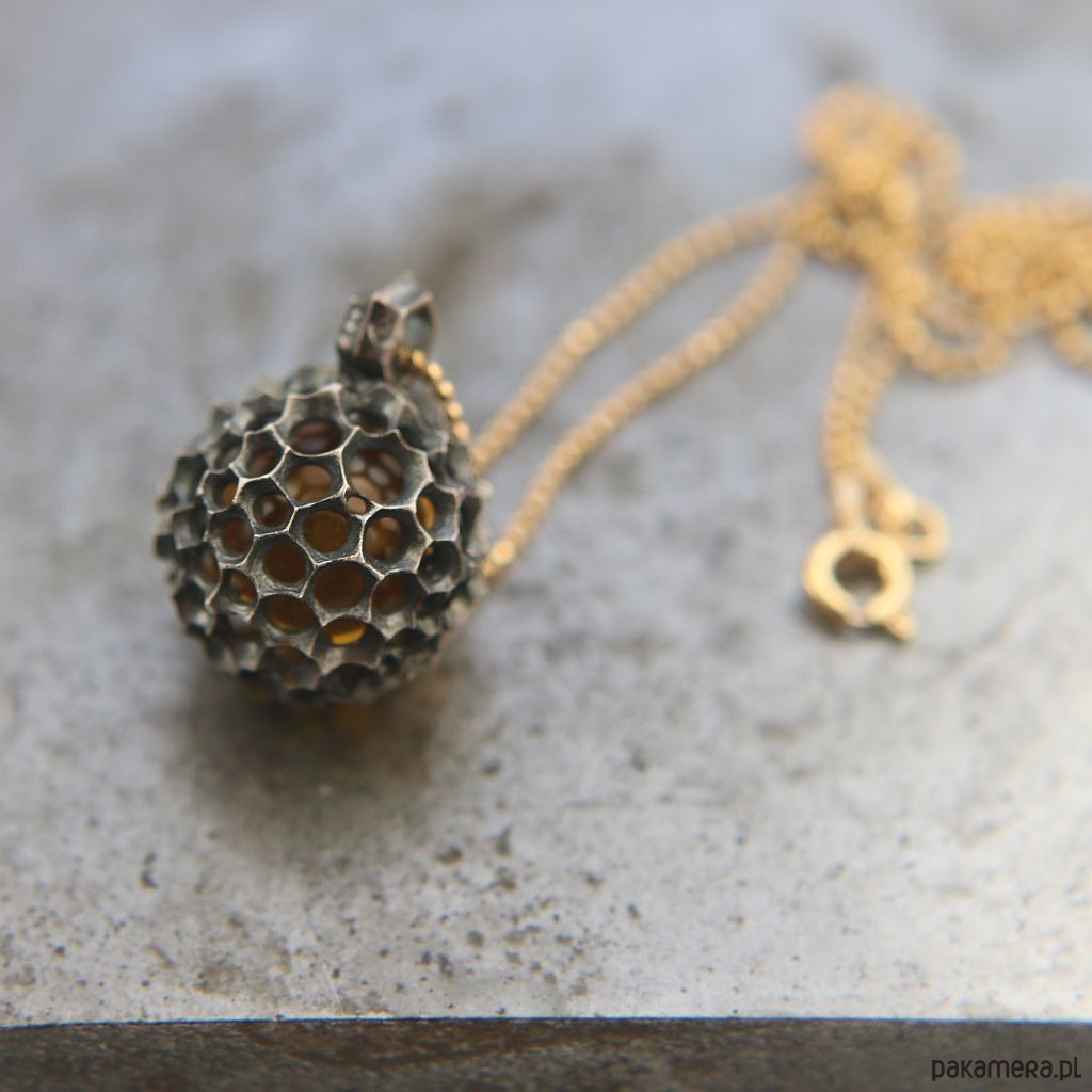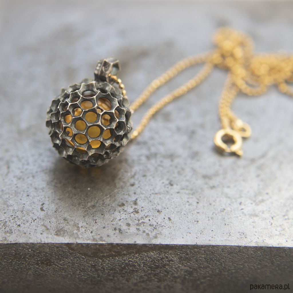 Lekki, ażurowy naszyjnik z obrotową zawieszką, powstał z myślą o pięknie bursztynu.