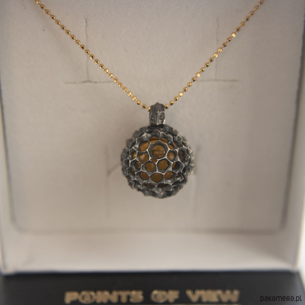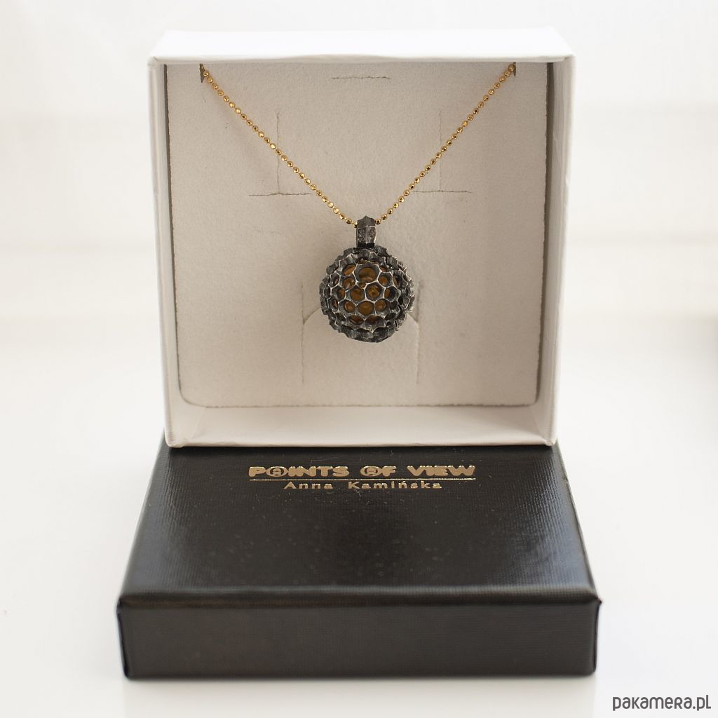 W projekcie tym, światło słoneczne prześwieca bursztyn, a naszyjnik zyskuje niepowtarzalny charakter.
