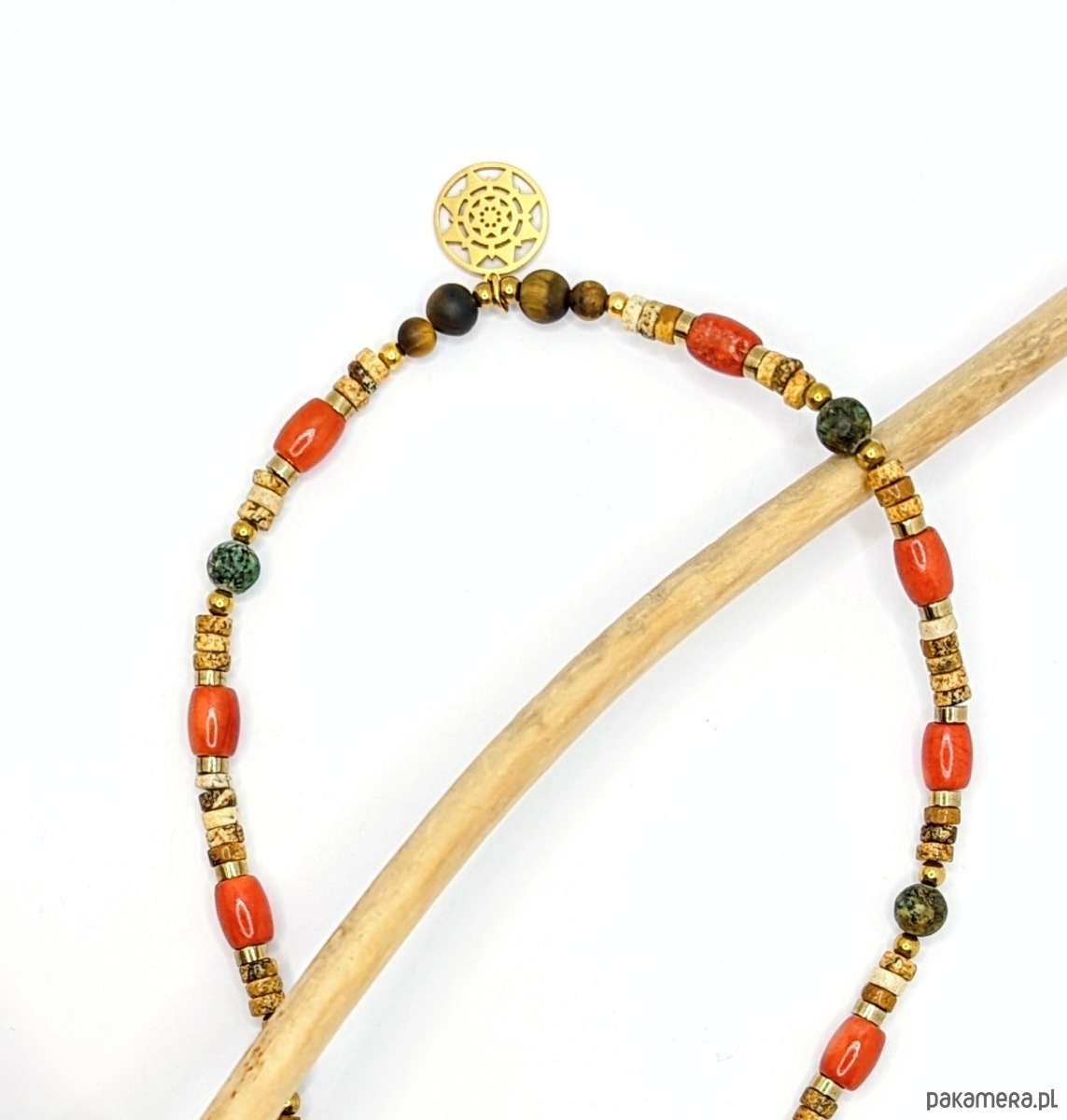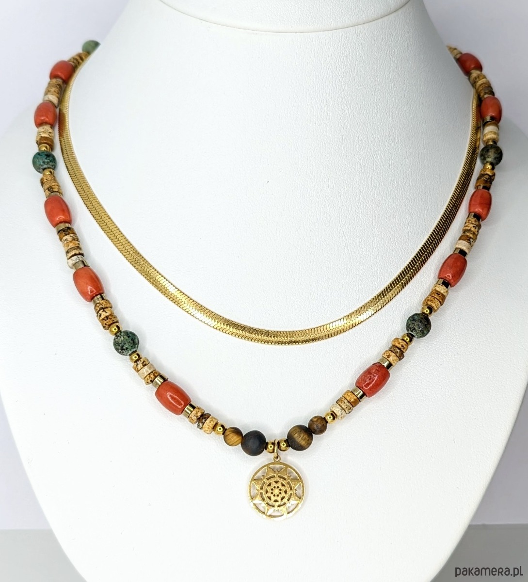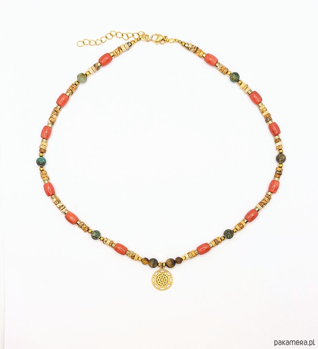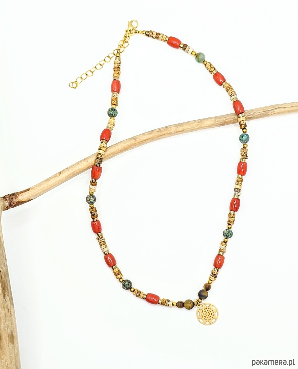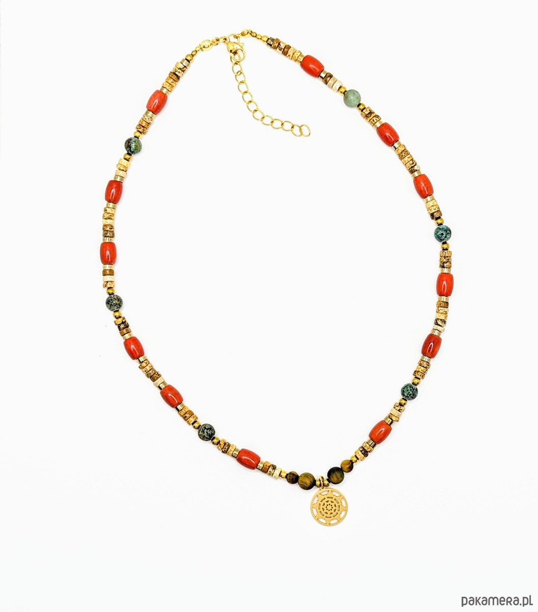 Naszyjnik Chilli to zestawienie krążków jaspisu z koralem oraz zmatowionymi kamieniami turkusu afrykańskiego i tygrysiego oka. Ciepła kolorystyka z dodatkiem pikantnego korala. Zawieszka ze stali chirurgicznej to słoneczko w azteckim stylu.