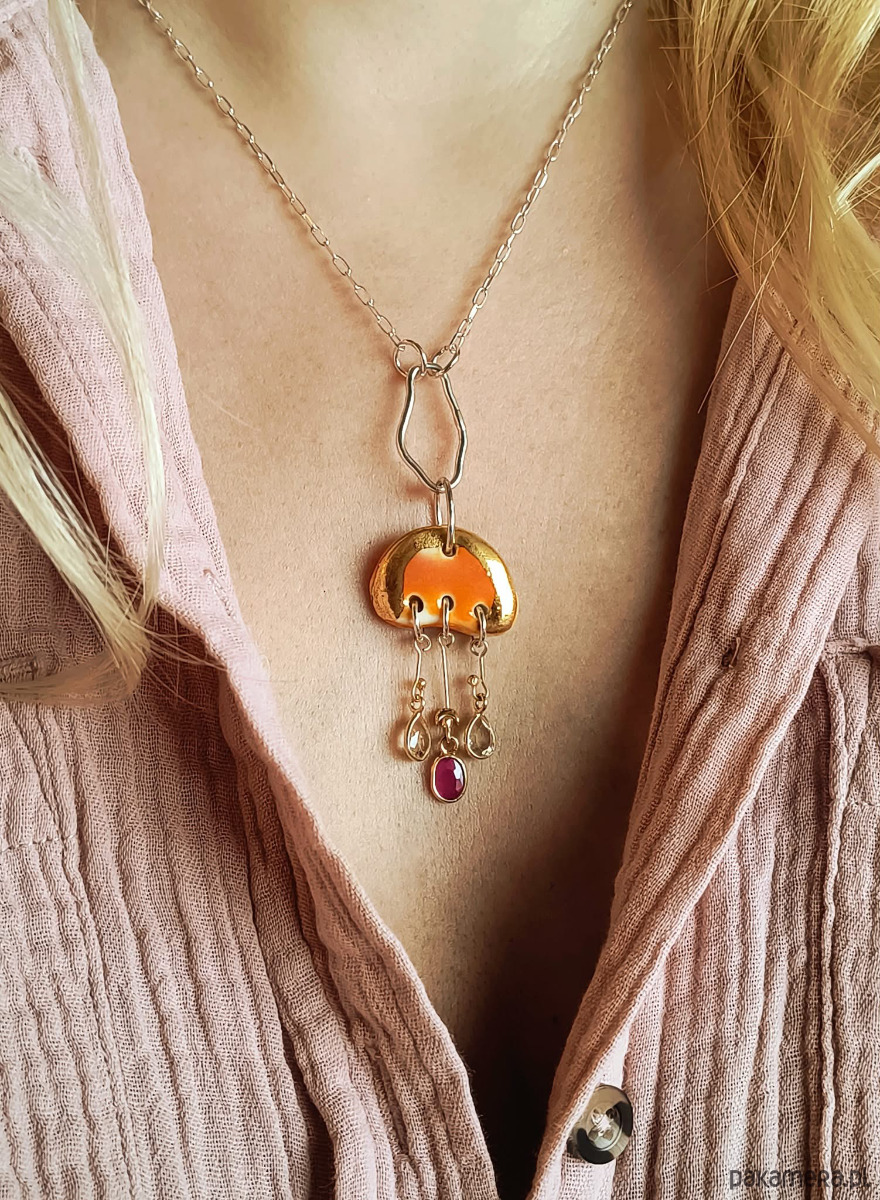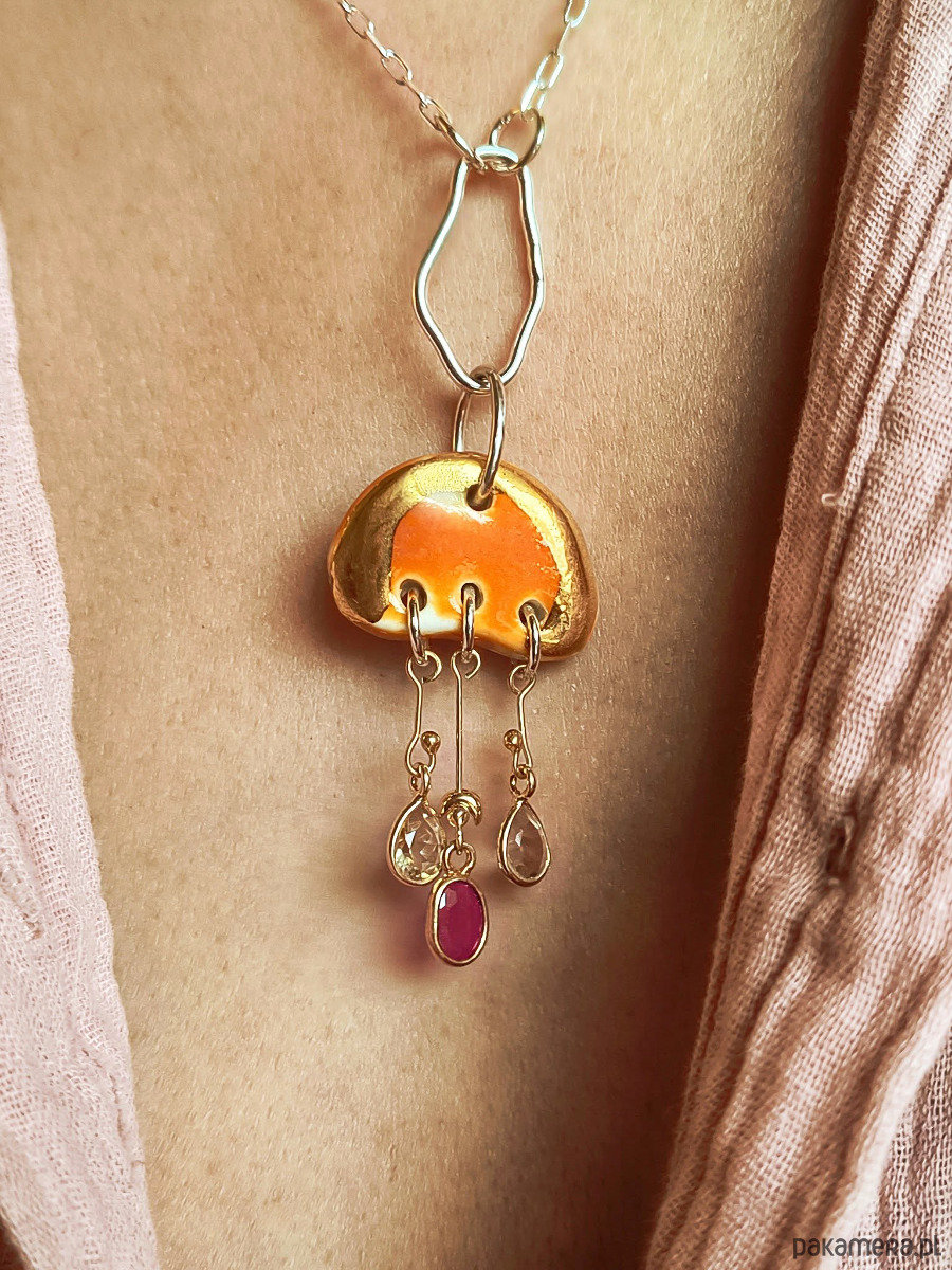 Materiał: srebro próby 925, 24-karatowe złoto, porcelana częściowo pokryta 24-karatowym złotem, kamienie naturalne: kryształ górski, cytryn, rubin
