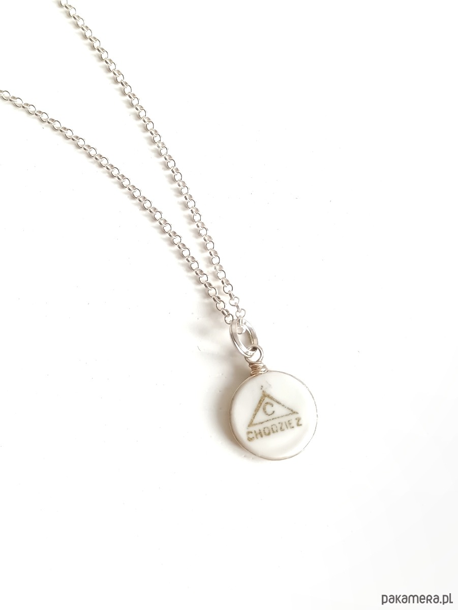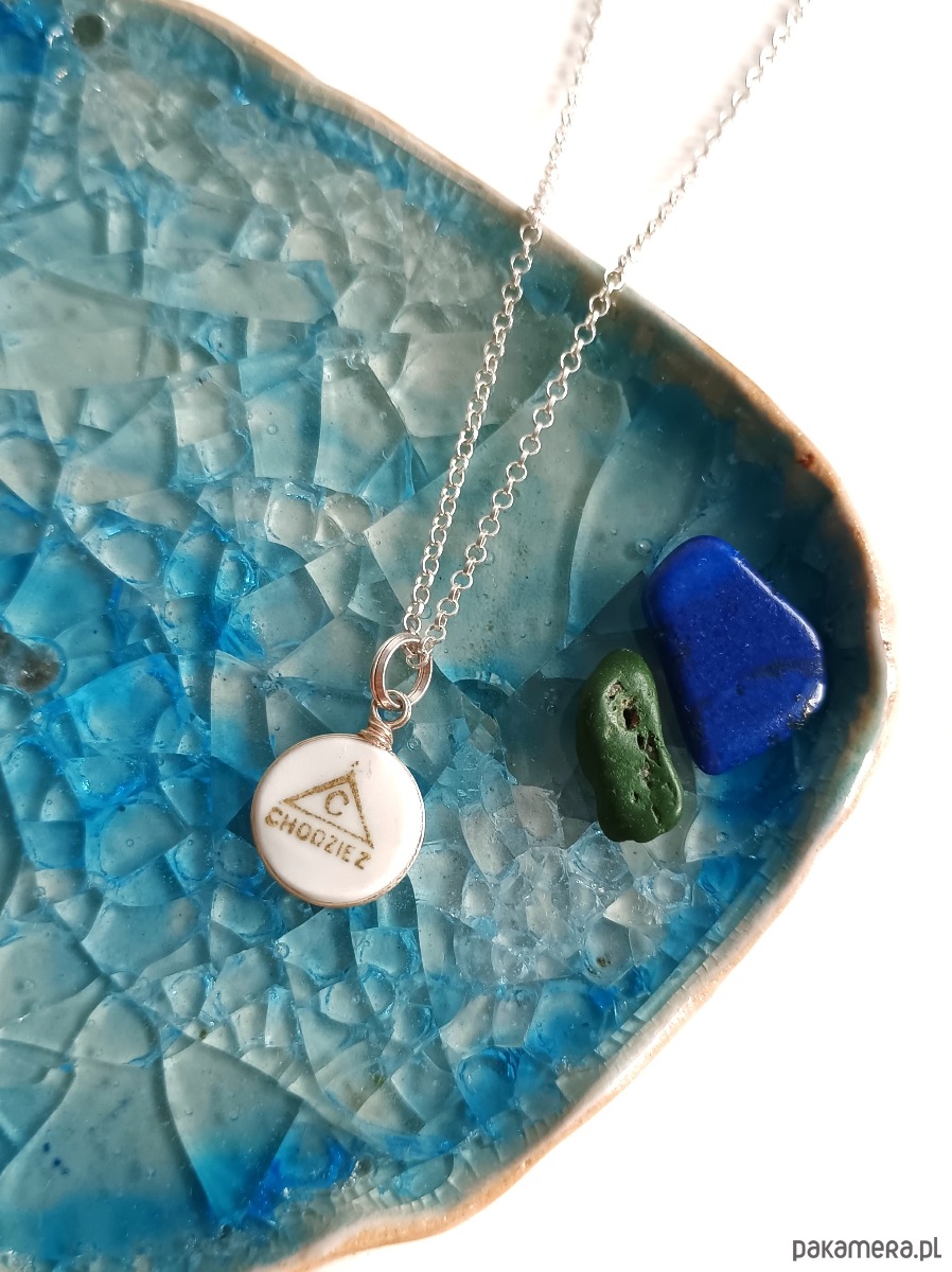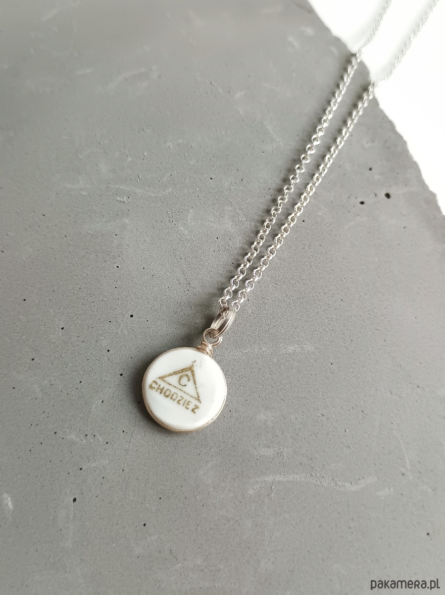 Oto naszyjnik, który wykonałam z fragmentu stłuczonego talerza z Chodzieży z widoczną sygnaturą. Kawałek stłuczki oszlifowałam nadając okrągły ksztalt, oprawiłam w drucik i zamocowałam na srebrnym łańcuszku (srebro 925). Brzegi pokryłam lakierem, co sprawia, że nie brudzą się i nie chłoną wilgoci. Średnica zawieszki ceramicznej: 13 mm. Długość łańcuszka w całości: 45 cm. Unikat - każdy z moich wyrobów występuje w jednym egzemplarzu. Upcykling - nie reprodukuję wykorzystywanych wzorów, niczego nie domalowuję - wykorzystuję wyłącznie oryginalne naczynia i motywy, które się na nich znajdują. Tym samym, stłuczce z odzysku nadaję nowe życie.