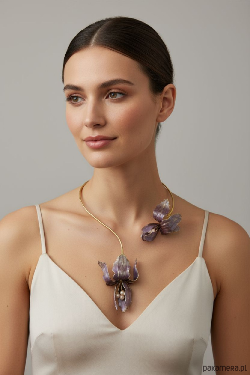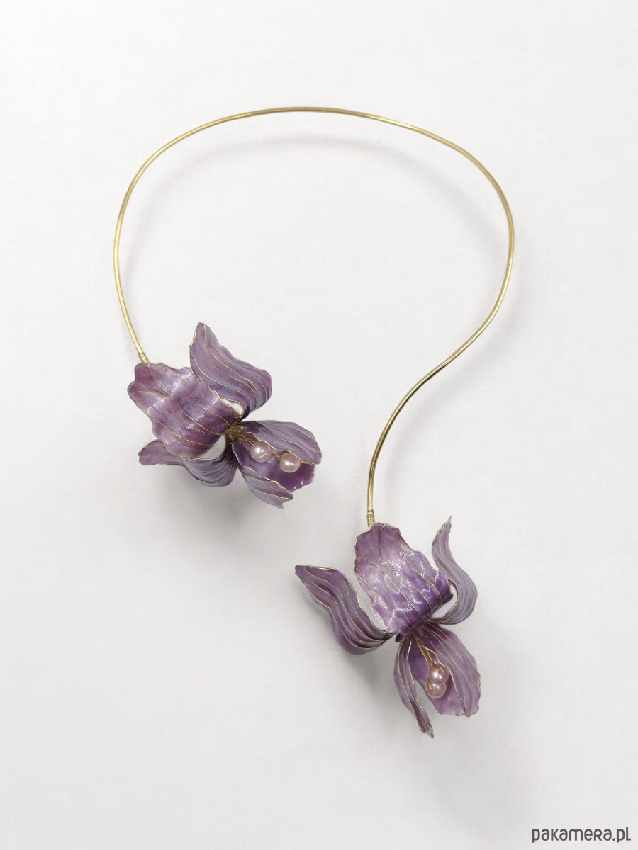 Wyjątkowy naszyjnik ELIVE został wykonany ręcznie na bazie z drutu mosiężnego, centralnym punktem ozdoby są dwa misternie wykonane kwiaty z żywicy, inspirowane delikatnością i formą irysów. Kwiaty zachwycają unikalnymi odcieniami – głębokim fioletem Pomp and Power oraz subtelnym, przydymionym różem Mauve, które pięknie się dopełniają.