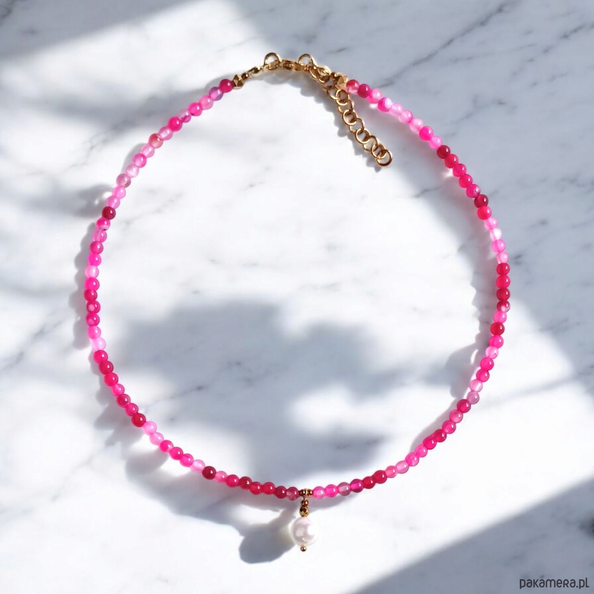 Naszyjnik na solidnej lince stalowej (miękkiej) - został wykonany z różowego agatu (barwa niejednolita - od bardzo jasnego różu aż do ciemnej fuksji) ok. 4mm, dużej perły słodkowodnej ok.10mm oraz przekładek ze złotego hematytu.