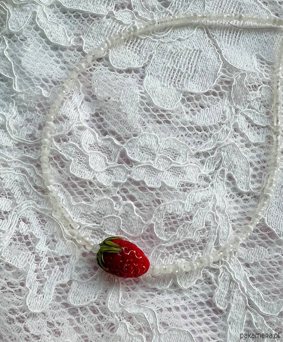 Wykonany jest z fasetowanych, drobniutkich koralików z muszli, a główną rolę gra tutaj piękna, czerwona poziomka wykonana w polskiej pracowni szkła artystycznego.