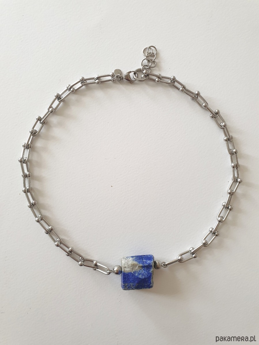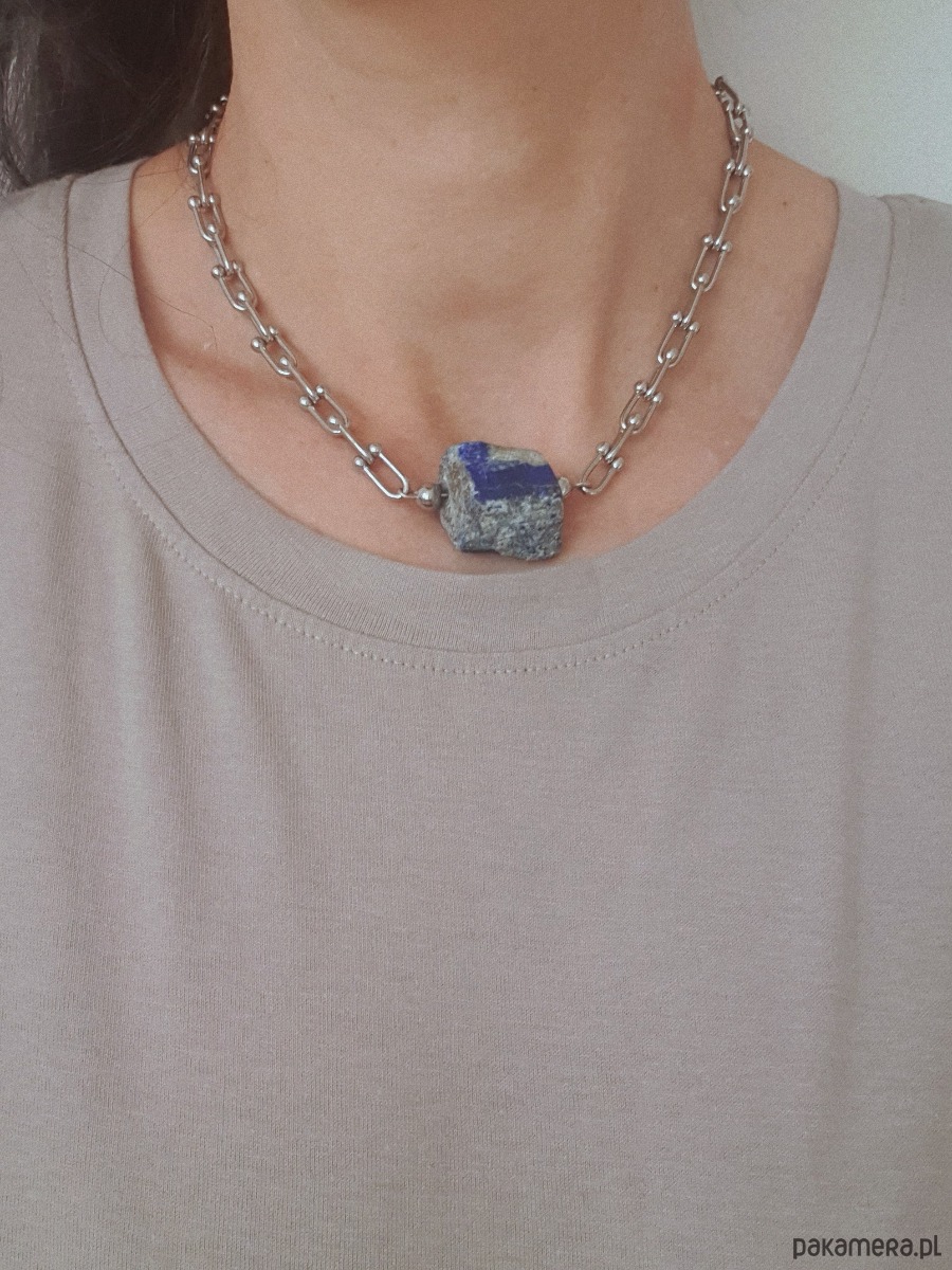 Minimalistyczny, unikatowy choke z kolekcji RAW, gruby łańcuch ręcznie tworzony ze stali szlachetnej z wyjątkowym surowym, lekko oszlifowanym lapisem lazuli. Pojedyncze egzemplarze, mogę powtórzyć podobny wzór jeśli będę mieć jeszcze kamienie, i kamienie będą się trochę różnić kształtem i odcieniem.