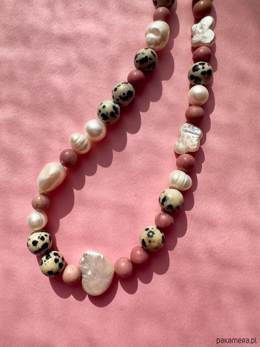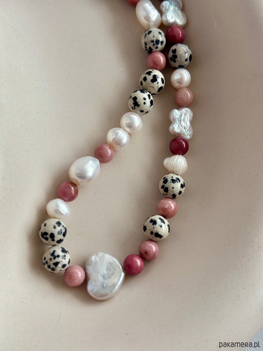 Jaspis dalmatyński, perełki naturalne o różnych kształtach, w tym w kształcie serca i chmurki, a jeszcze większej słodyczy i dziewczęcości dodaje różowy rodonit.