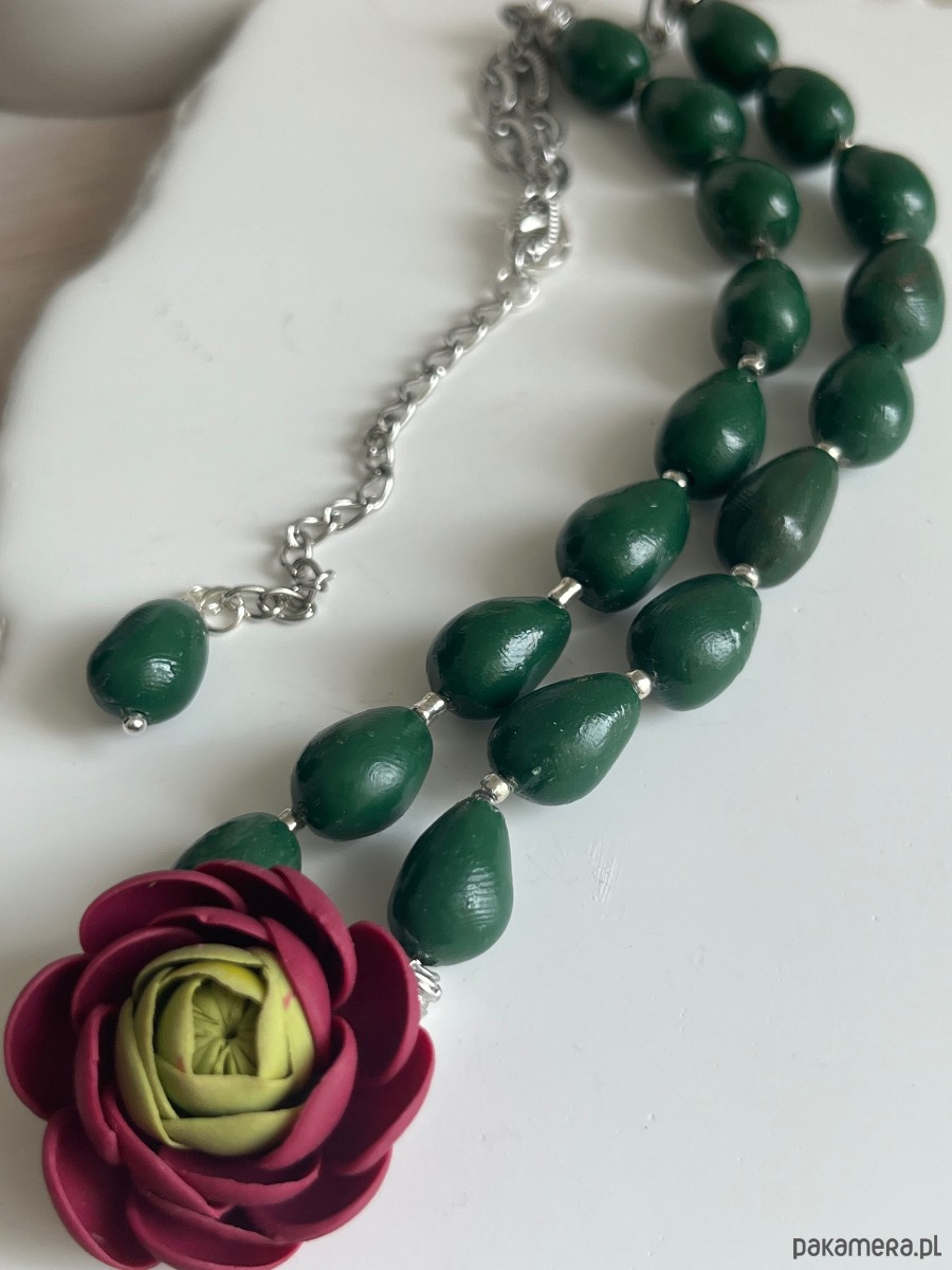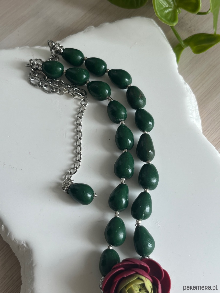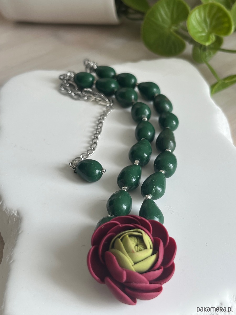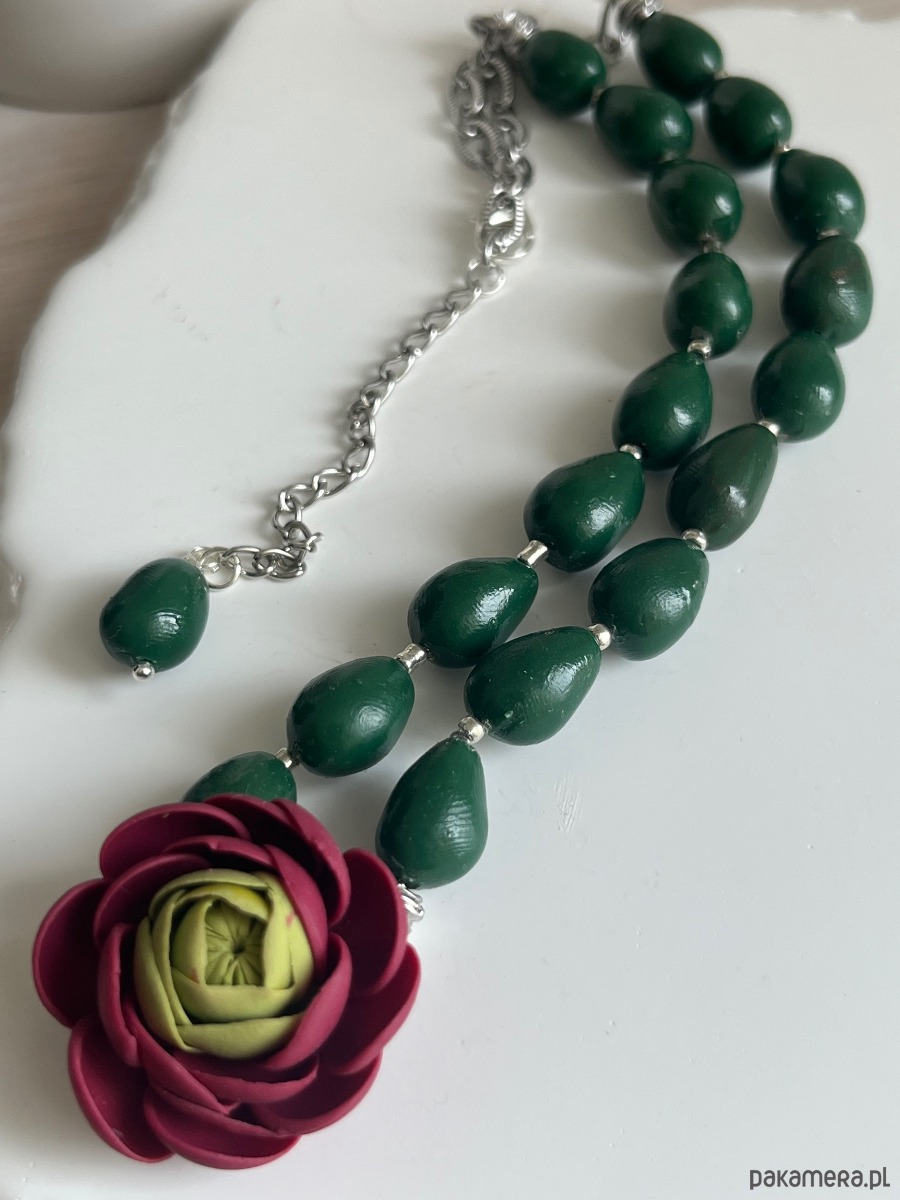 Kwiat spoczywa na sznurze eleganckich koralików w kształcie kropel o intensywnym, szmaragdowym kolorze. Kontrast między głęboką zielenią a burgundem kwiata tworzy królewską paletę barw, która emanuje prestiżem. Koraliki pięknie załamują światło, dodając naszyjnikowi blasku przy każdym ruchu. Kompozycja idealnie podkreśla linię szyi, sprawiając, że nawet najprostsza stylizacja nabiera wyrafinowanego charakteru.