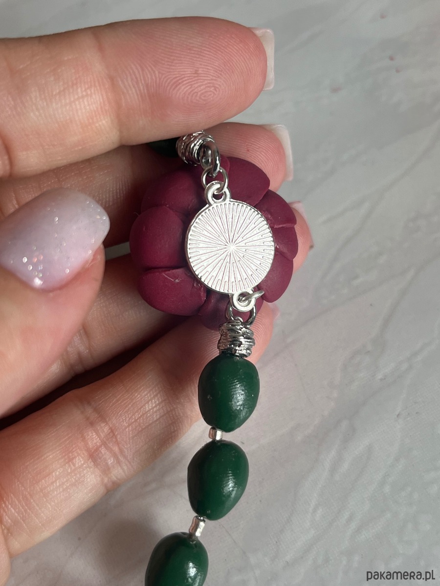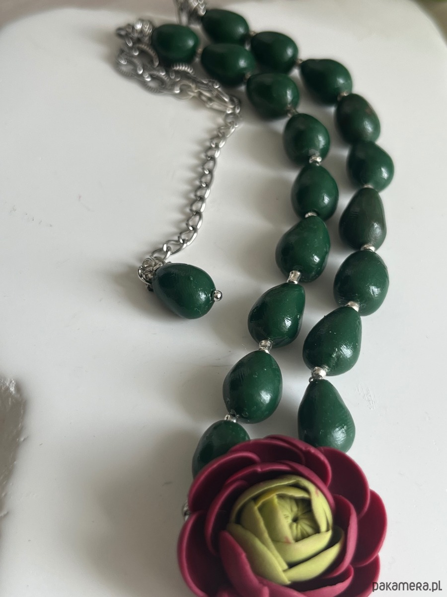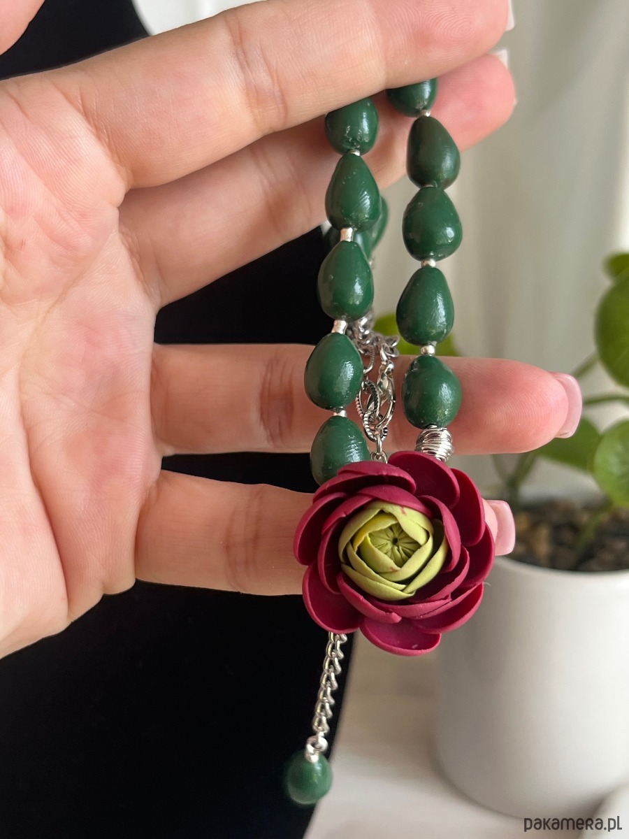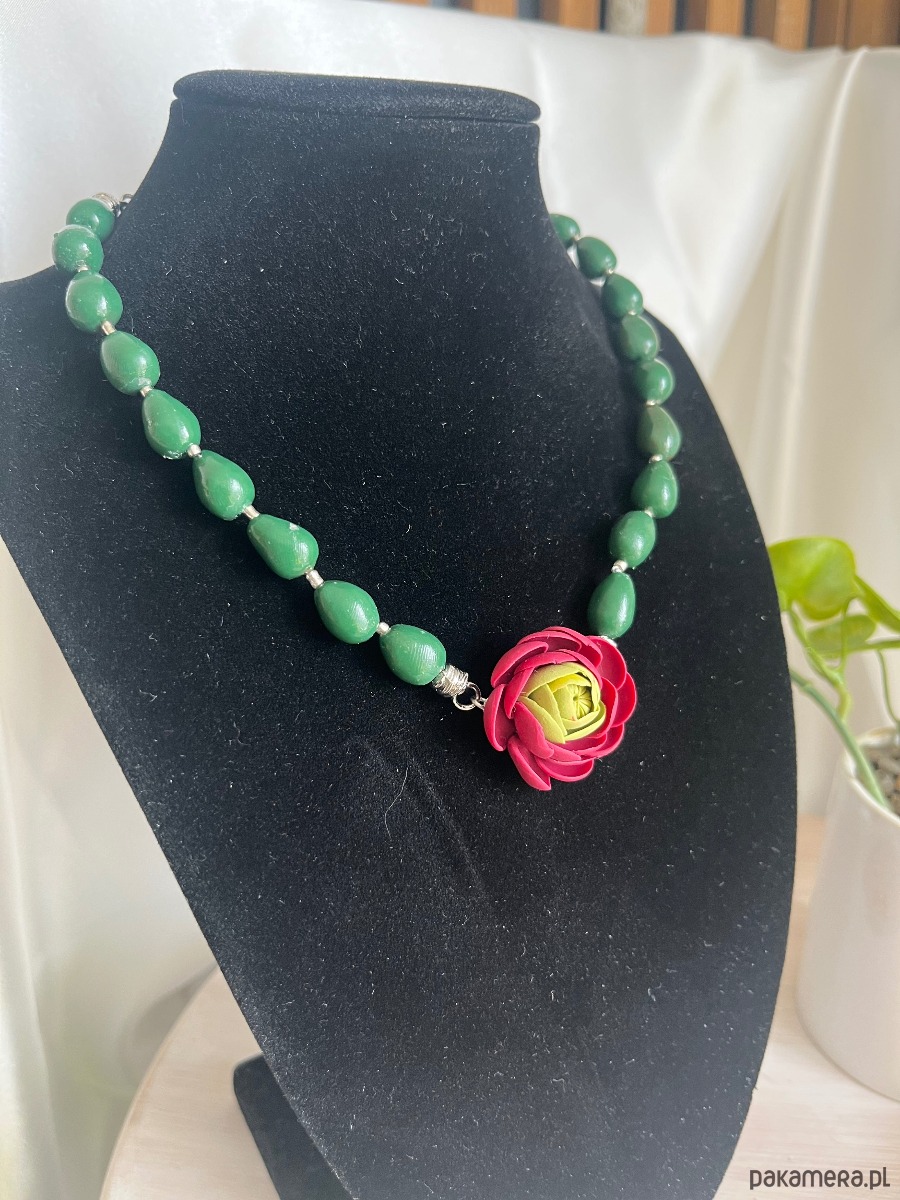 Kwiat spoczywa na sznurze eleganckich koralików w kształcie kropel o intensywnym, szmaragdowym kolorze. Kontrast między głęboką zielenią a burgundem kwiata tworzy królewską paletę barw, która emanuje prestiżem. Koraliki pięknie załamują światło, dodając naszyjnikowi blasku przy każdym ruchu. Kompozycja idealnie podkreśla linię szyi, sprawiając, że nawet najprostsza stylizacja nabiera wyrafinowanego charakteru.