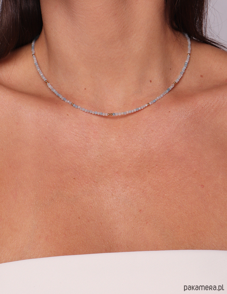 Delikatny, minimalistyczny naszyjnik typu choker wykonany z naturalnego akwamarynu o średnicy ok. 2 mm. Kamienie mają subtelny, chłodny odcień błękitu, który pięknie rozświetla skórę i dodaje stylizacji świeżości oraz lekkości. Drobne, pozłacane elementy ze srebra 925 uzupełniają całość i nadają jej eleganckiego charakteru. OpakowanieNaszyjnik zapakowany będzie w minimalistyczne, granatowe pudełko ze złotym logo. Wewnątrz pudełka znajdziesz białą wkładkę z nazwą kamienia oraz jego wyjątkowymi właściwościami. Dbaj o biżuterię. Unikaj kontaktu z wodą, detergentami i kosmetykami.