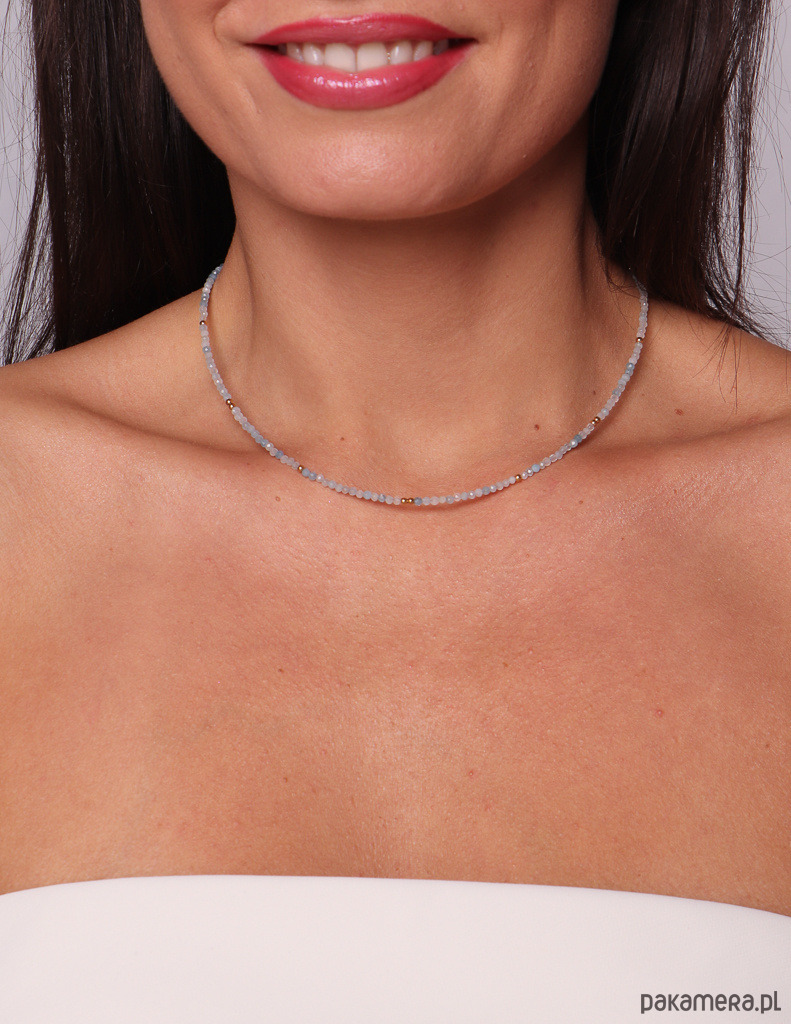 Delikatny naszyjnik typu choker wykonany z naturalnego akwamarynu o średnicy ok. 2 mm. Kamienie mają subtelny, szary odcień z charakterystyczną, chłodną poświatą, która pojawia się pod światło — to właśnie labradoryzacja, dzięki której ten minerał jest tak wyjątkowy i ceniony.