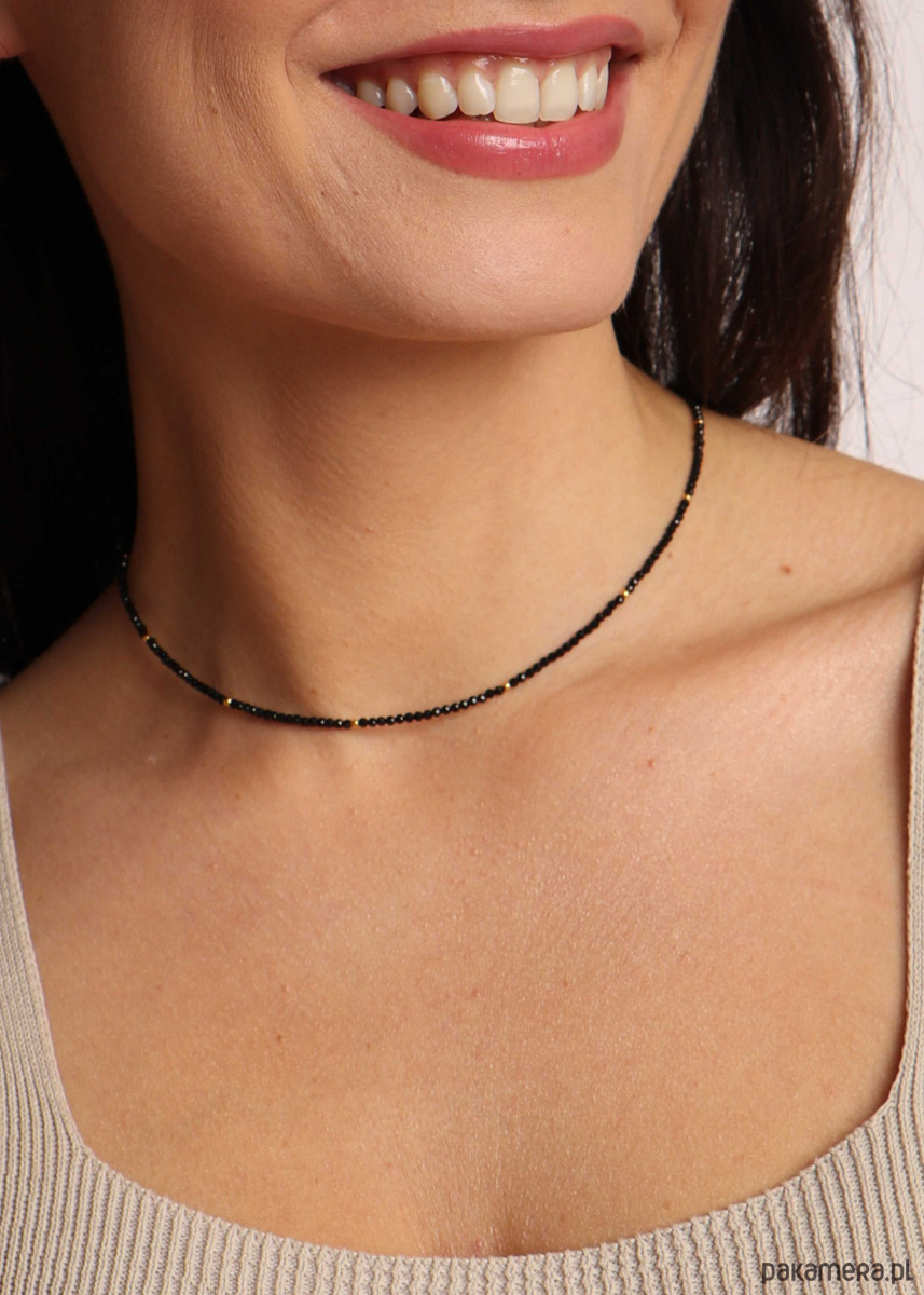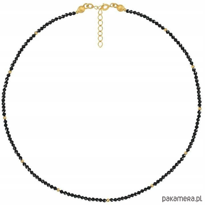Pozłacany choker z czarnym spinelem i drobnymi kulkami wykonany ze srebra pozłacanego próby 925.