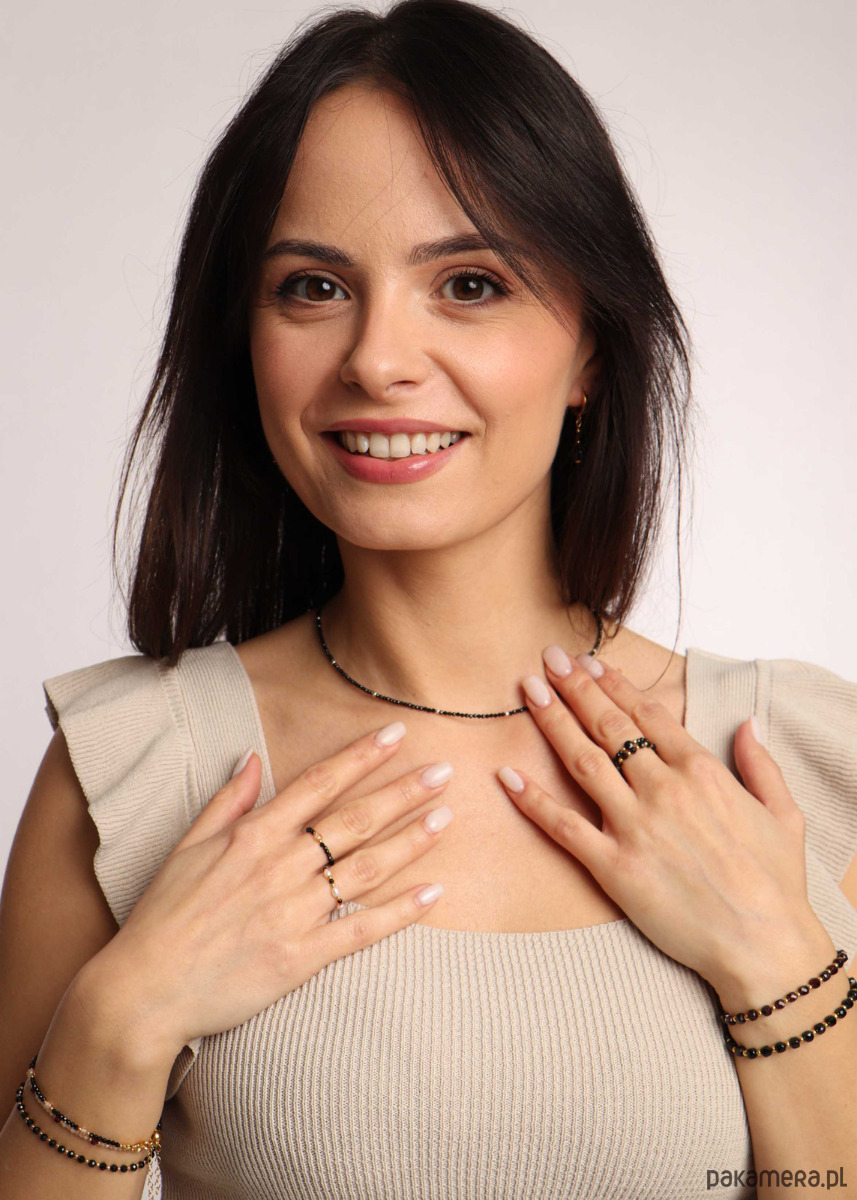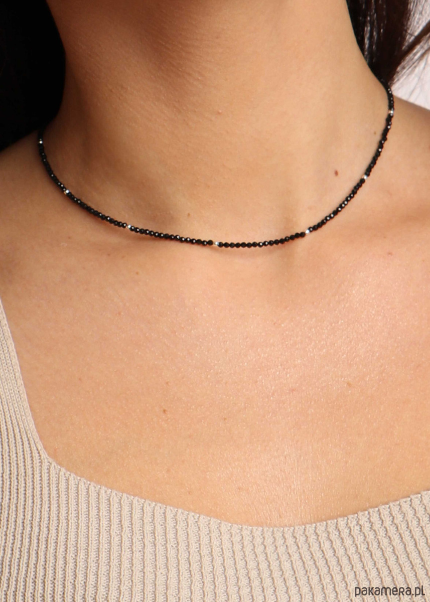 Wysokiej jakości naszyjnik choker z czarnym spinelem, przekładany srebrnymi kulkami próby 925.