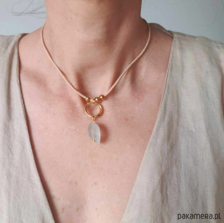 Autorski naszyjnik, choker z kamieniem księżycowym, ozdobnym elementem z mosiądzu złoconego (24 karat złoto) nieregularnym kółkiem i kulkami ze stali szlachetnej złoconej, na rzemyku naturalnym. Ten ozdobny, wielofunkcyjny naszyjnik jest idealny na specjalne okazje, ale tez na co dzień, świetnie wygląda z czarną, beżową sukienką czy lnianą bluzką.