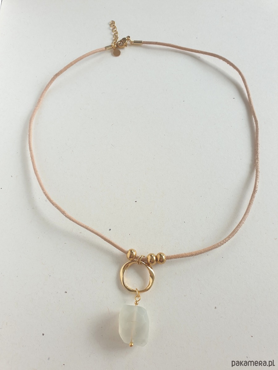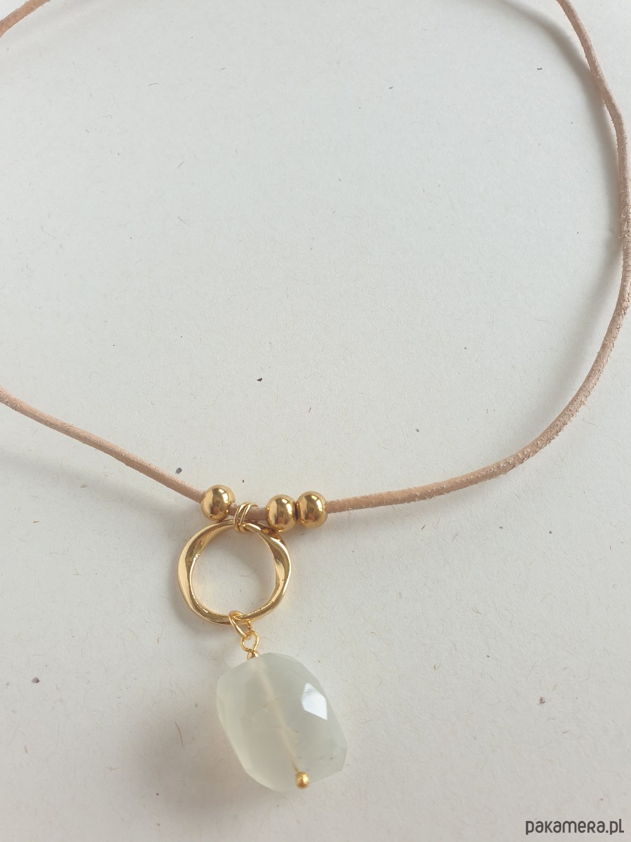 Naszyjnik / choker z kamieniem księżycowym, na rzemyku, mosiądz złocony