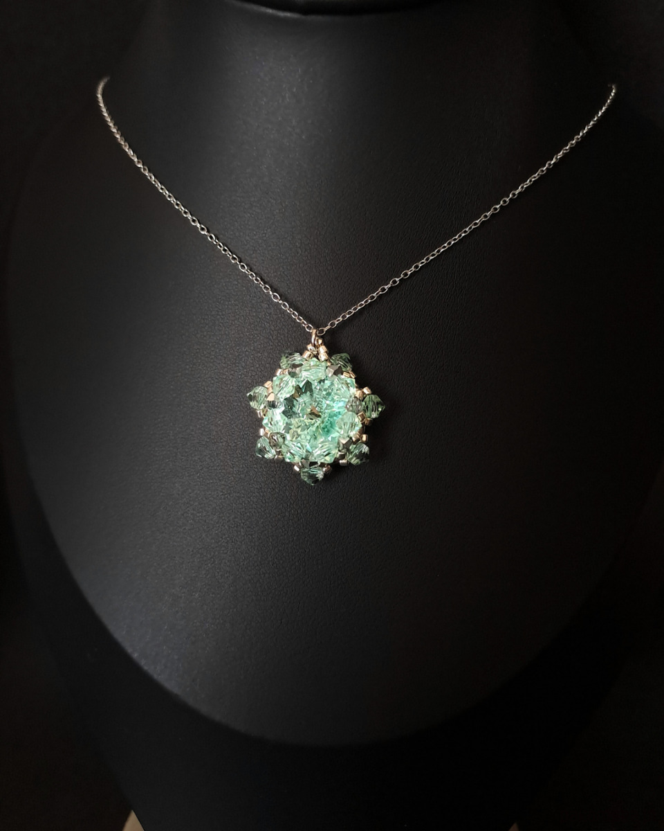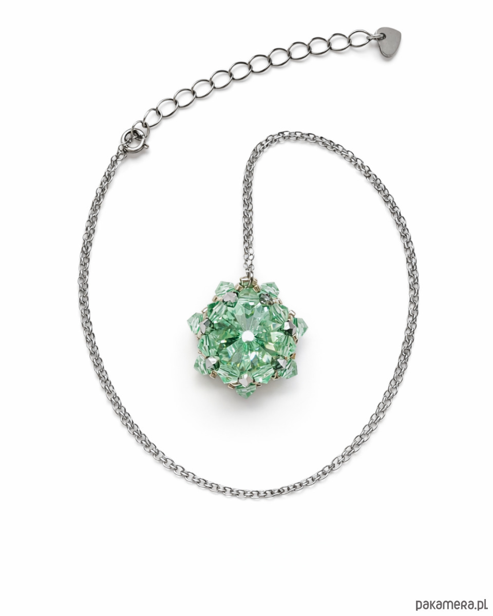 Centralnym elementem naszyjnika jest kamień Preciosa Rivoli Maxima o średnicy 14 mm w odcieniu Chrysolite - głębokiej zieleni o wyjątkowej czystości i intensywnym blasku. Kamień otoczony został kryształkami Preciosa Bicone oraz koralikami Miyuki Delica, znanymi z jubilerskiej precyzji i idealnej regularności. Zawieszka o wymiarach 2,7 × 2,9 cm umieszczona jest na delikatnym łańcuszku ze stali nierdzewnej.
