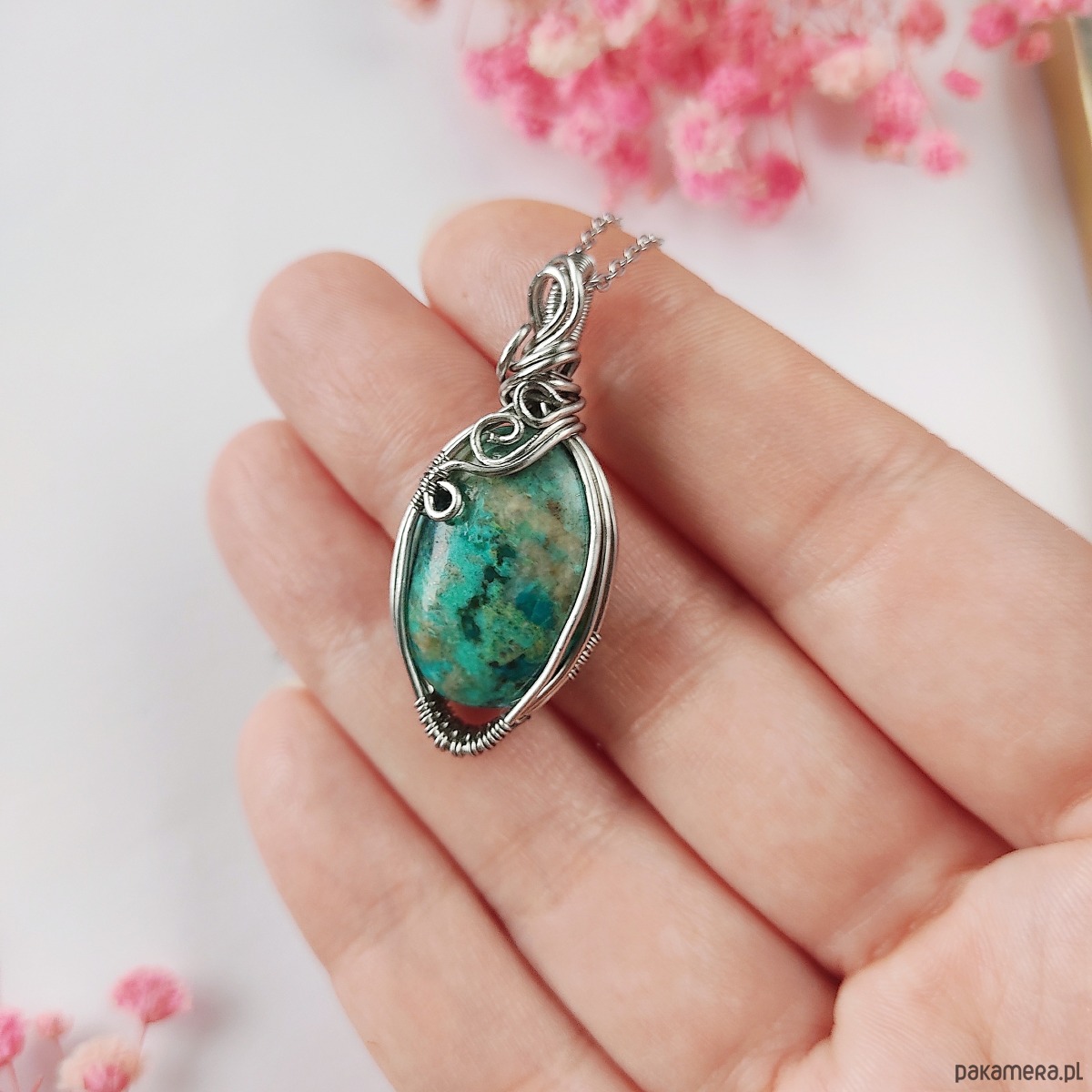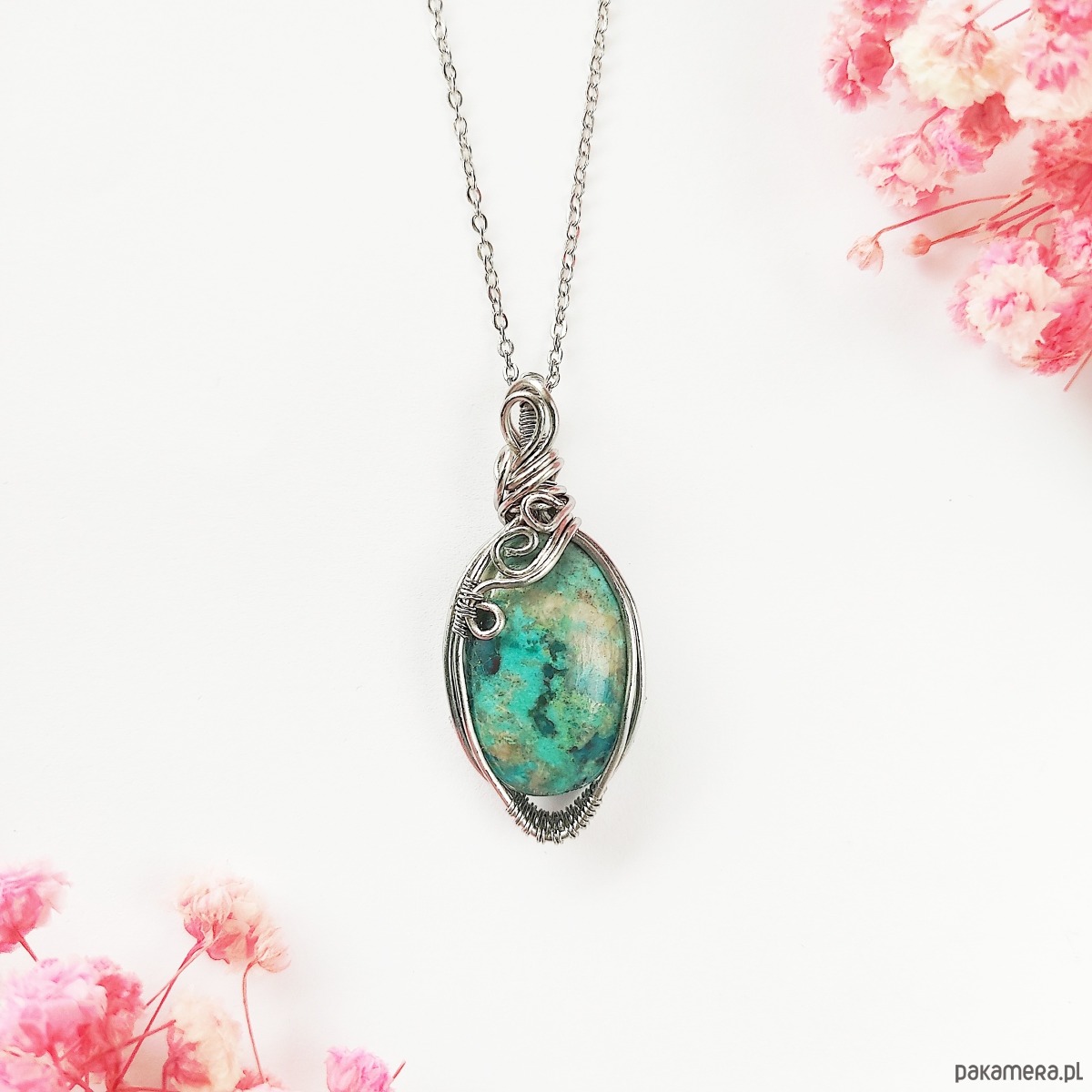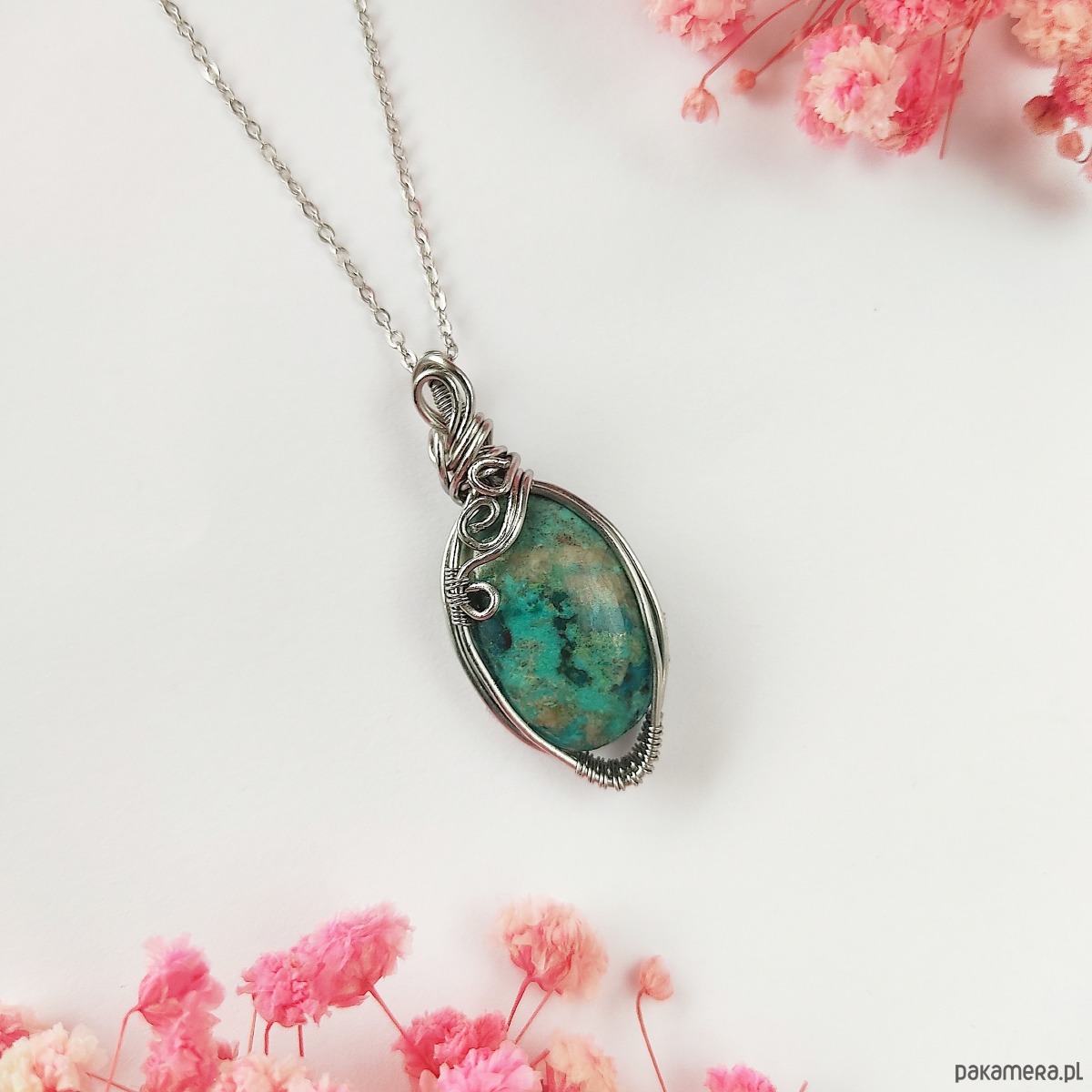 Naszyjnik Chryzokola stal chirurgiczna wisiorek handmade wirewrapping