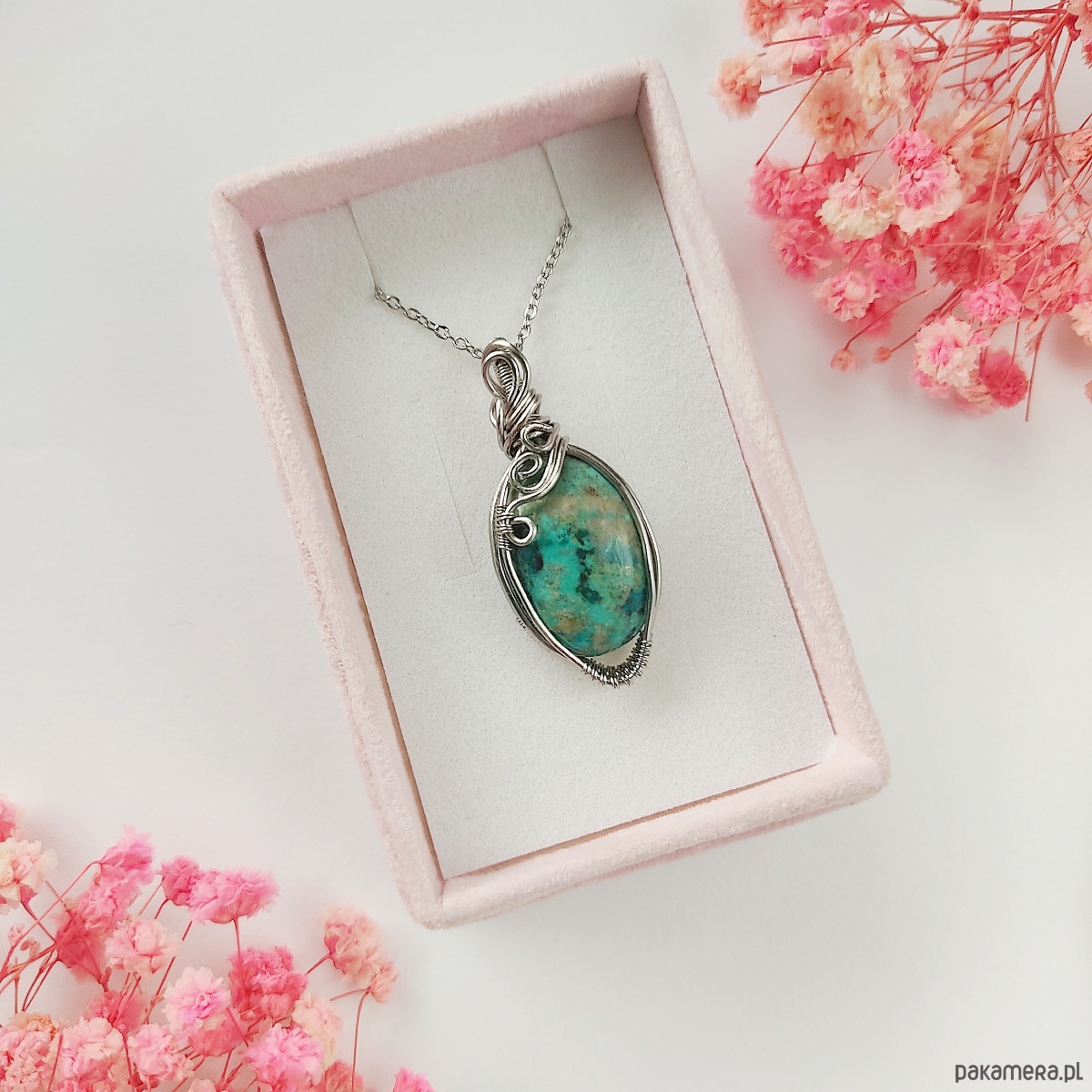 Naszyjnik Chryzokola zapakowany w ozdobne pudełko lub woreczek na biżuterię.