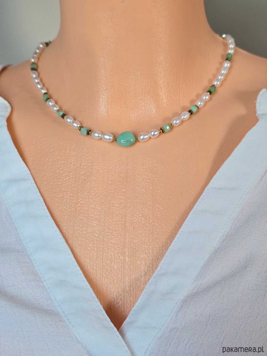 Piękny, krótki naszyjnik wykonany z intensywnie zielonego chryzoprazu i pereł naturalnych. Naszyjnik będzie subtelną ozdobą szyi.