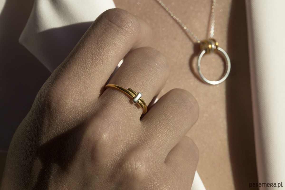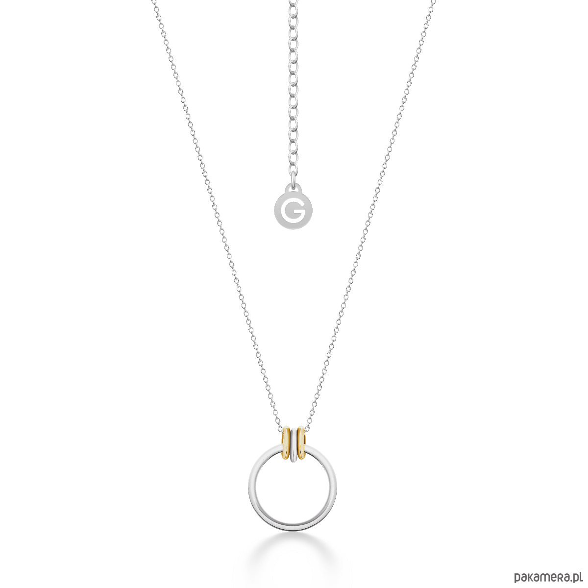Minimalistyczny naszyjnik ze srebrnym kółkiem ozdobiony trzema małymi srebrno-złoconymi kółeczkami.