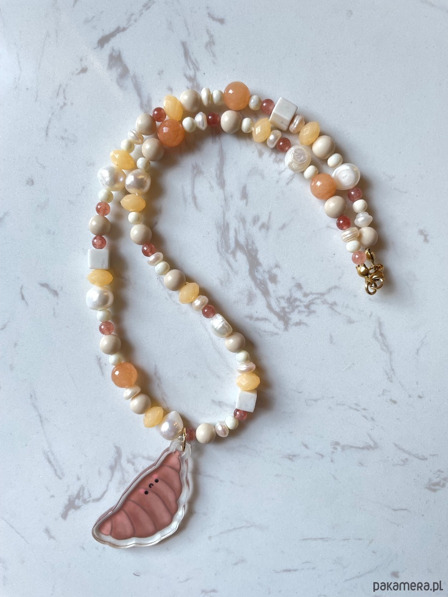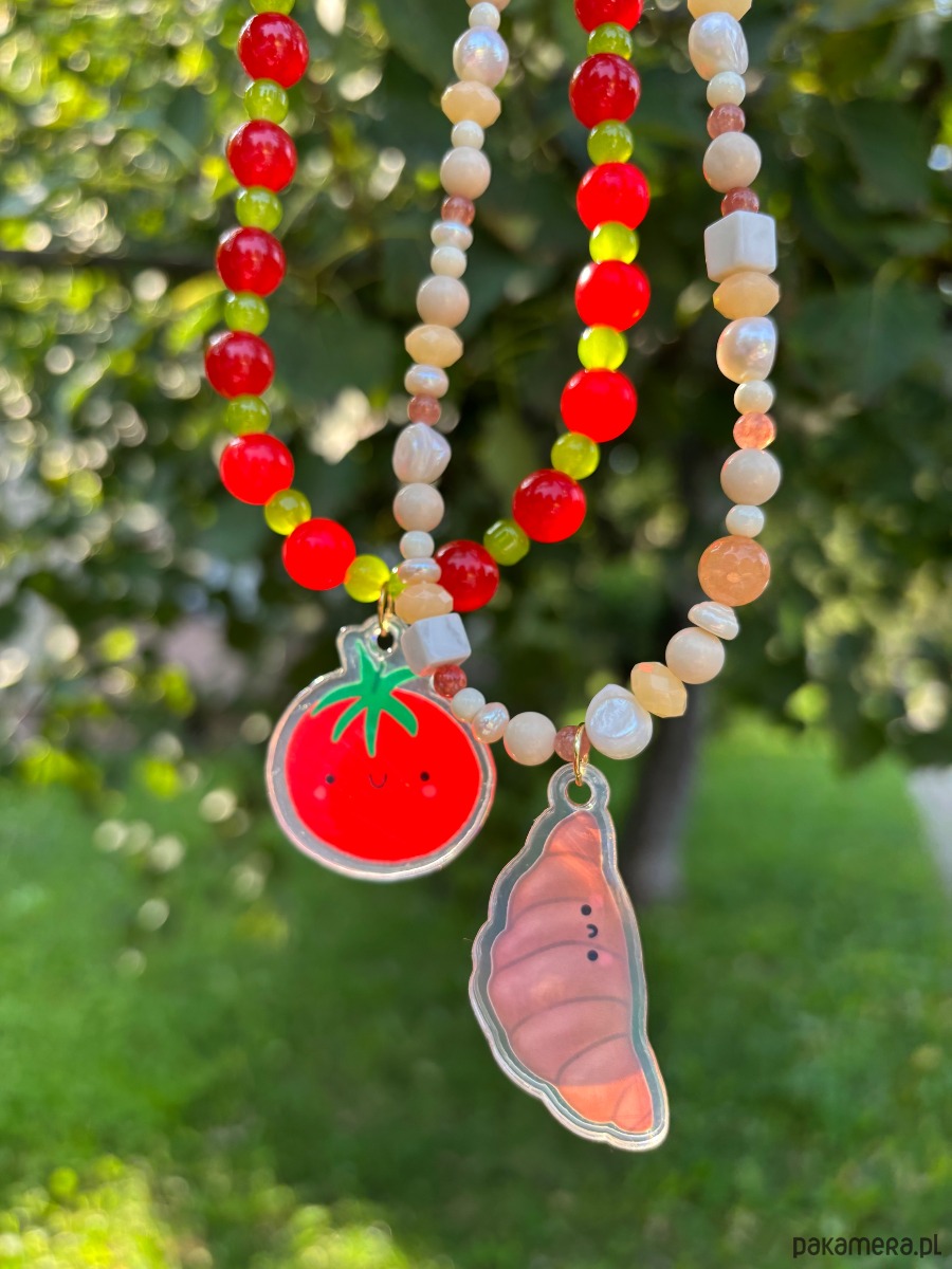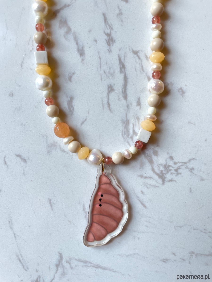 Naszyjnik CROISSANT 🥐 stworzony we współpracy z Martą Turek (autorka zawieszki pomidorek; ilustratorka) ❤️ naszyjnik wykonany ze szklanych koralików, pereł, kamieni narurlanych, koralików akrylowych i zawieszki z akrylu 🍅