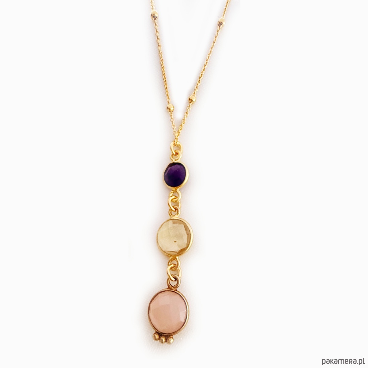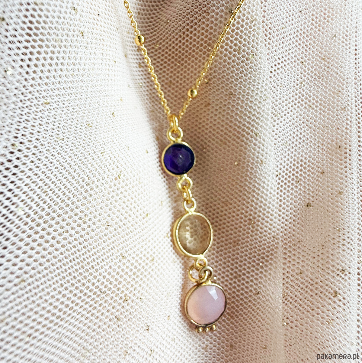 Elegancki naszyjnik z trzema naturalnymi kamieniami: kwarcem różowym, ametystem i cytrynem, osadzonymi w delikatnym okuciu. Kamienie ułożone jeden pod drugim tworzą smukłą, harmonijną linię, która subtelnie podkreśla dekolt i nadaje biżuterii nowoczesny, minimalistyczny charakter.