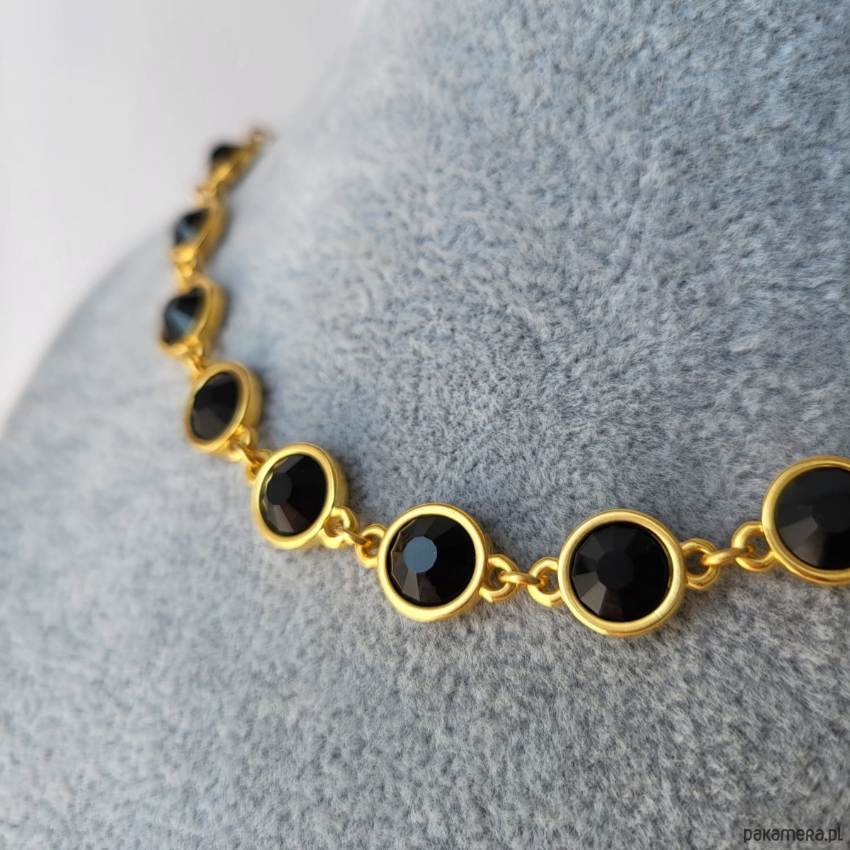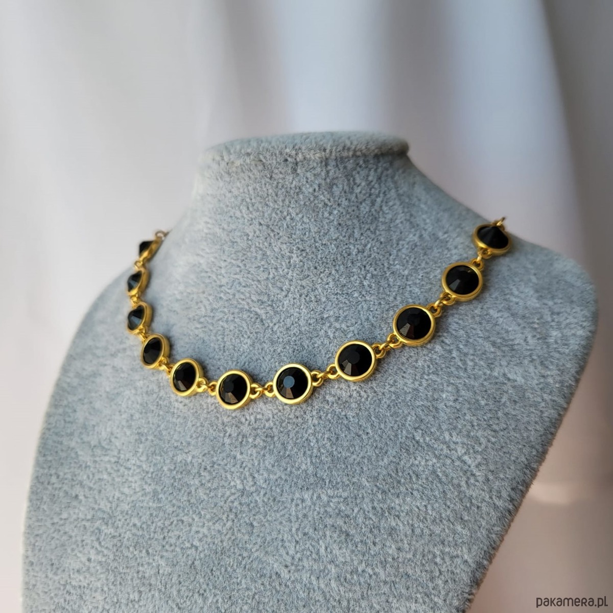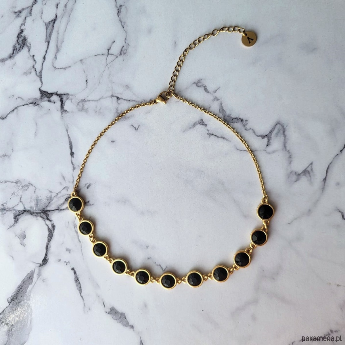 Naszyjnik z czarnymi kryształami w okuciu, wykonany ze stali szlachetnej oraz cyny pozłacanej. Naszyjnik można nosić w wersji blisko oplatającej szyję niczym choker lub w wersji nieco luźniejszego, opadającego pod szyją łańcuszka. Naszyjnik zapinany jest na karabińczyk, z możliwością regulacji długości, dzięki dodatkowej przedłużce (+5 cm). Całość prezentuje się szykowanie i wyraziście. Doskonale sprawdzi się do wieczorowych kreacji.