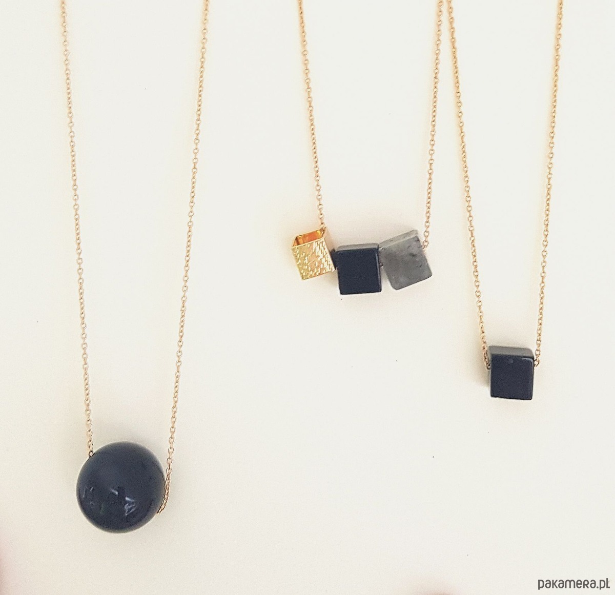 Minimalistyczny, geometryczny, nowoczesny, długi naszyjnik z trzema kostkami.