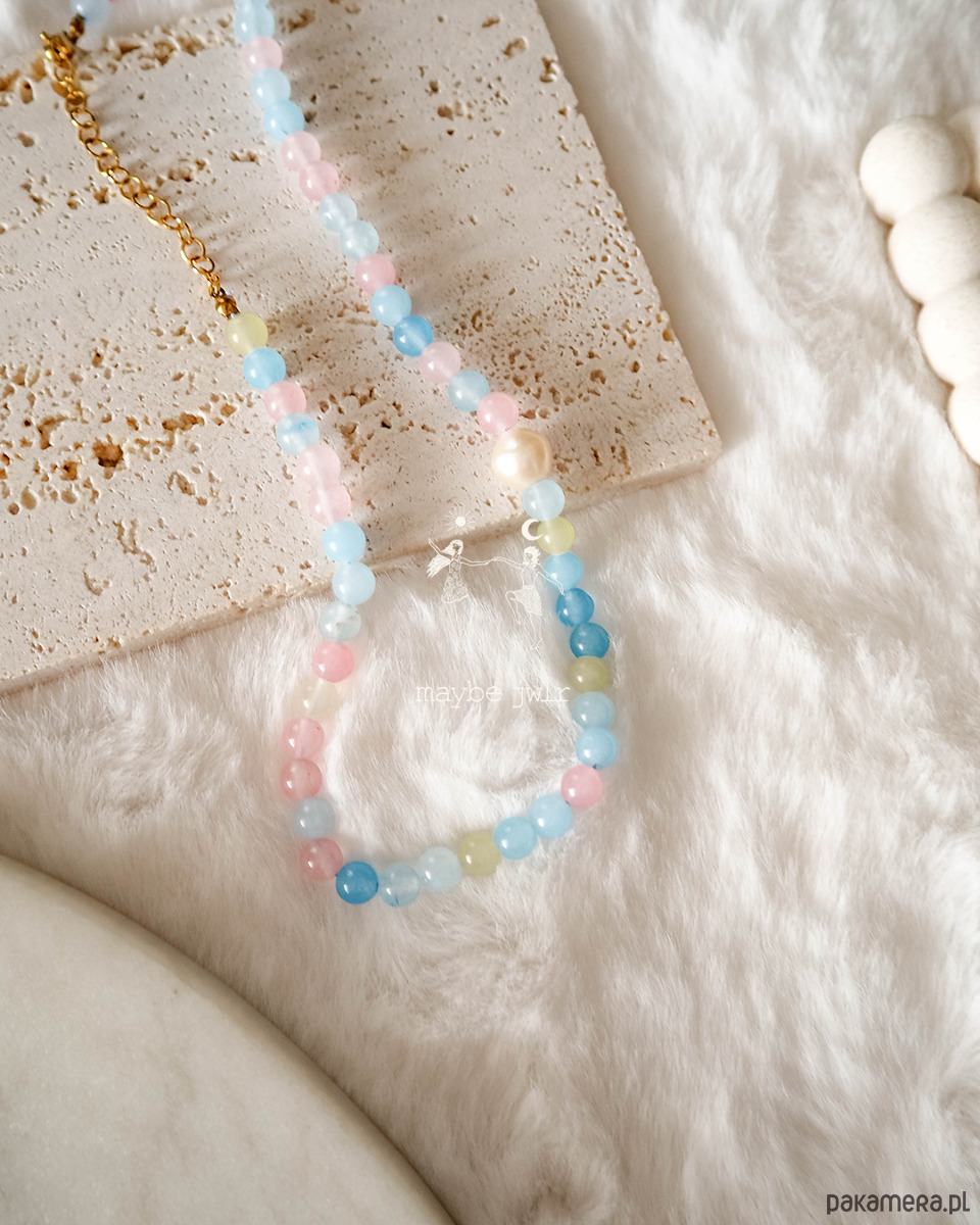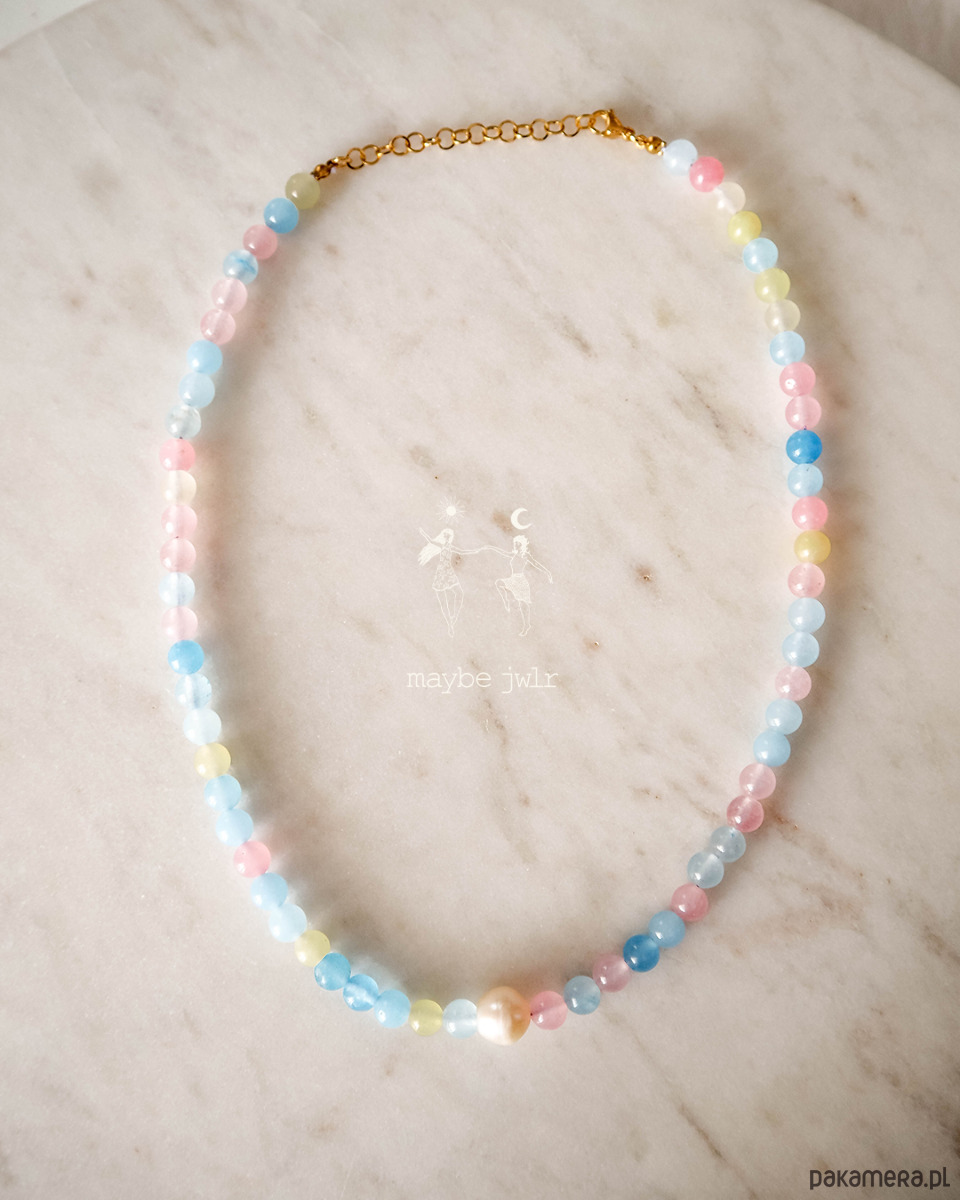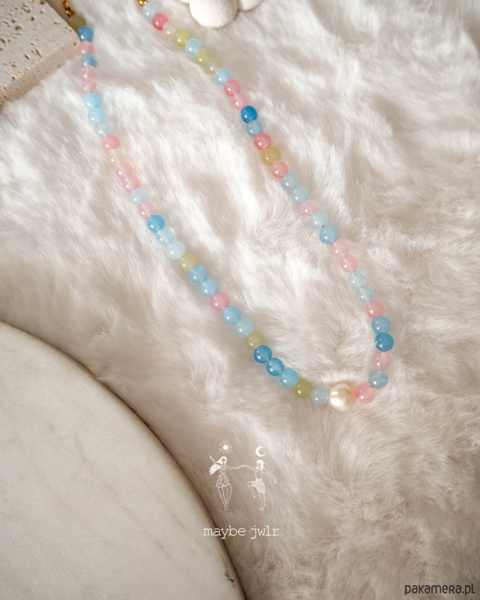Naszyjnik Cukierkowy jest lekki, pełen dziewczęcego uroku dla osób, które kochają pastelowe barwy i pozytywną energię naturalnych kamieni. Jego sercem są jadeity w delikatnych, cukierkowych odcieniach oraz połyskująca perła słodkowodna, które razem tworzą biżuterię o subtelnym, radosnym charakterze.
