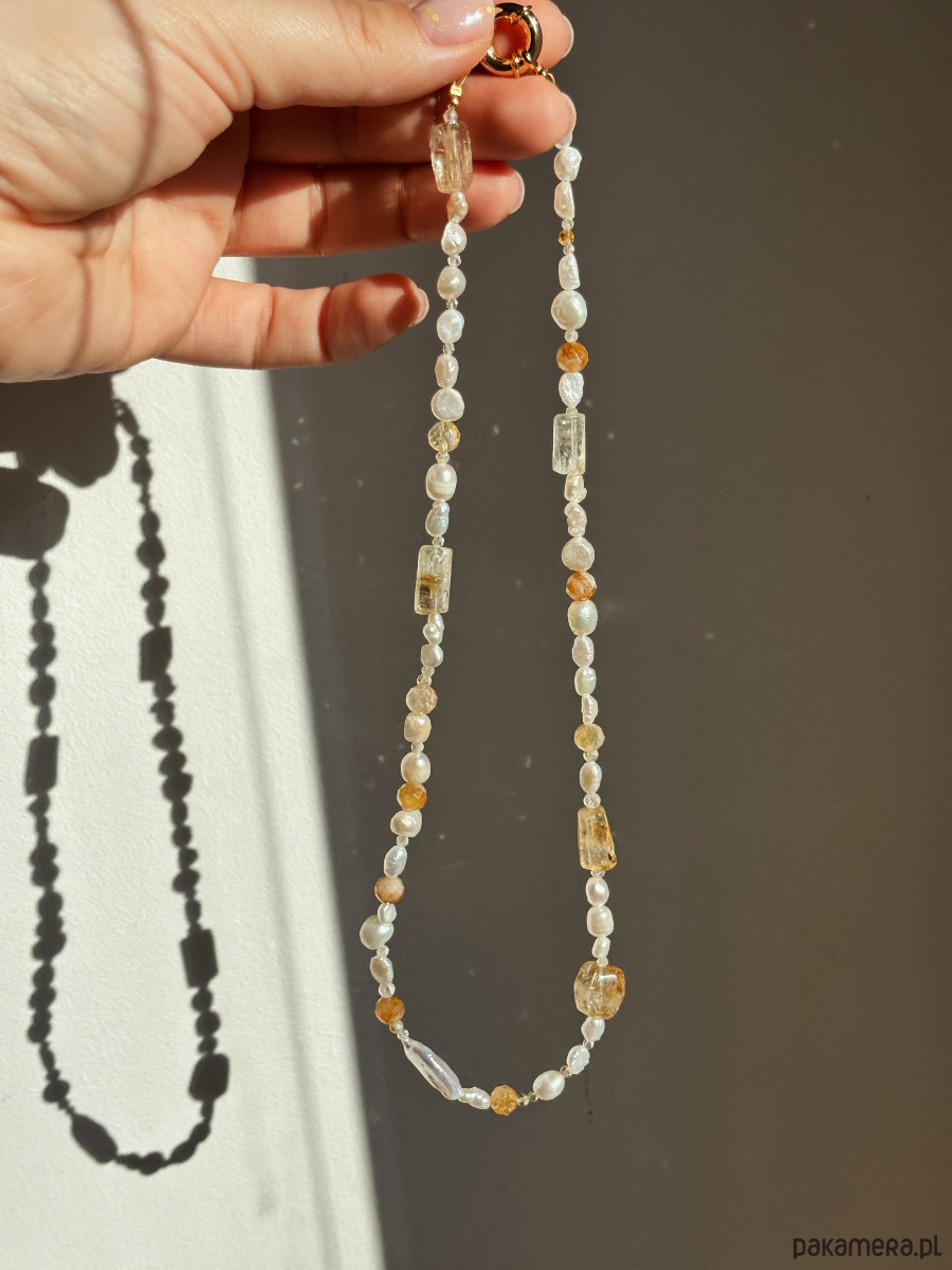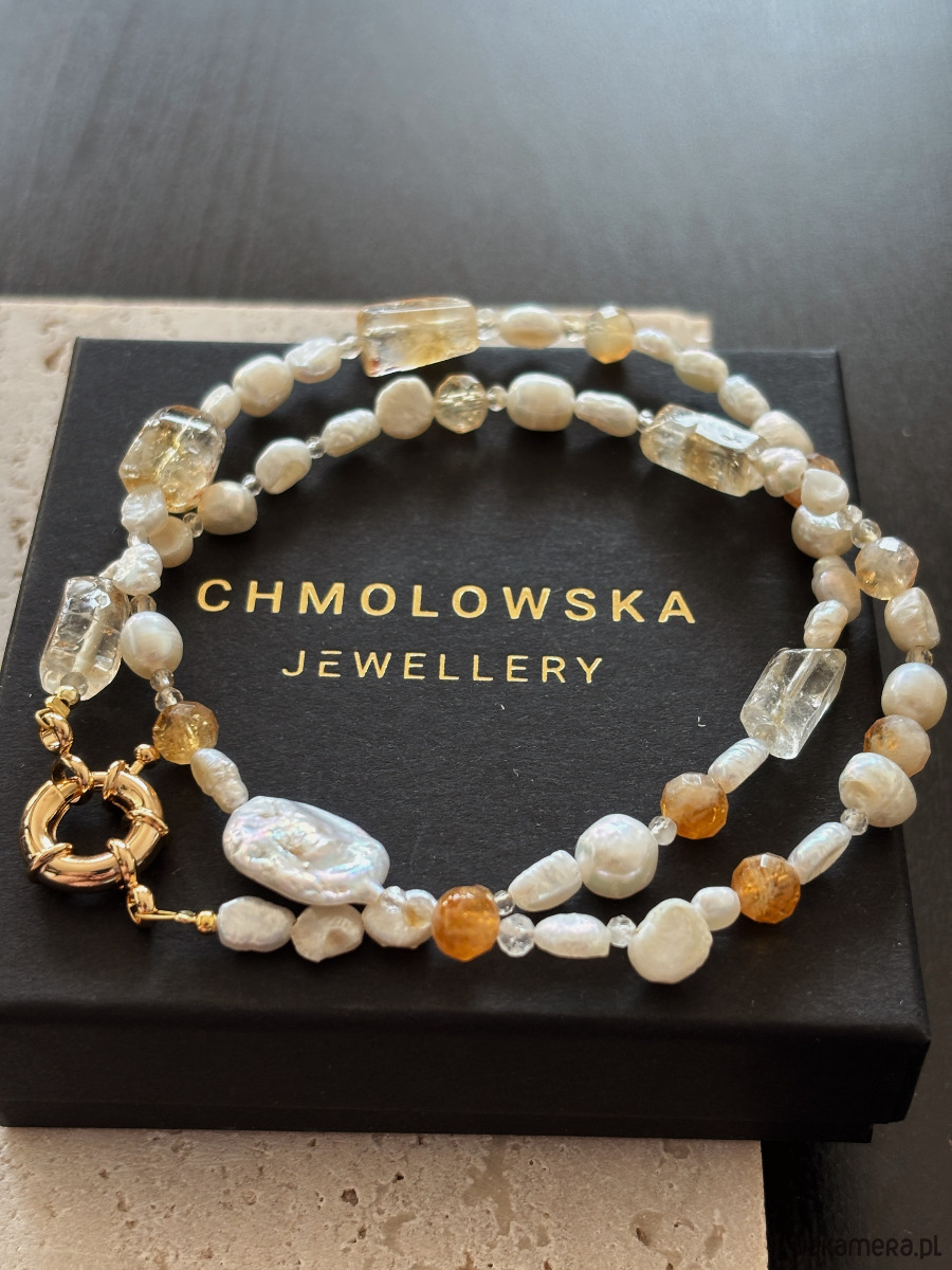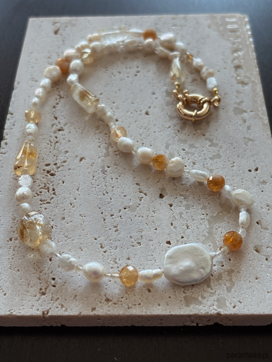 Naszyjnik wykonany jest na lince jubilerskiej z kamieni Cytrynu w różnych formach, Pereł naturalnych i ozdobnego zapięcia rodowanego złotem.